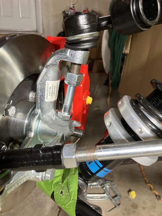 Upper ball joint removal When I installed the uprights, I'd forgotten to first assure that I had the same number of threads showing on both the RHS and LHS upper rod ends so that camber would be roughly in the right ball park. That meant that I had to pop the ball joint out of its socket. When searching for good ways to do that, folks mentioned using a tie rod fork, or hitting the socket with a hammer, or hitting the socket simultaneously with two hammers, or using a special tool, or using a combination of a bolt and nut to provide some upward force on the ball joint stud. I went with the latter option, as shown here. By turning the nut or bolt just slightly, it applied enough upward pressure to release the joint from its taper. Pretty easy.