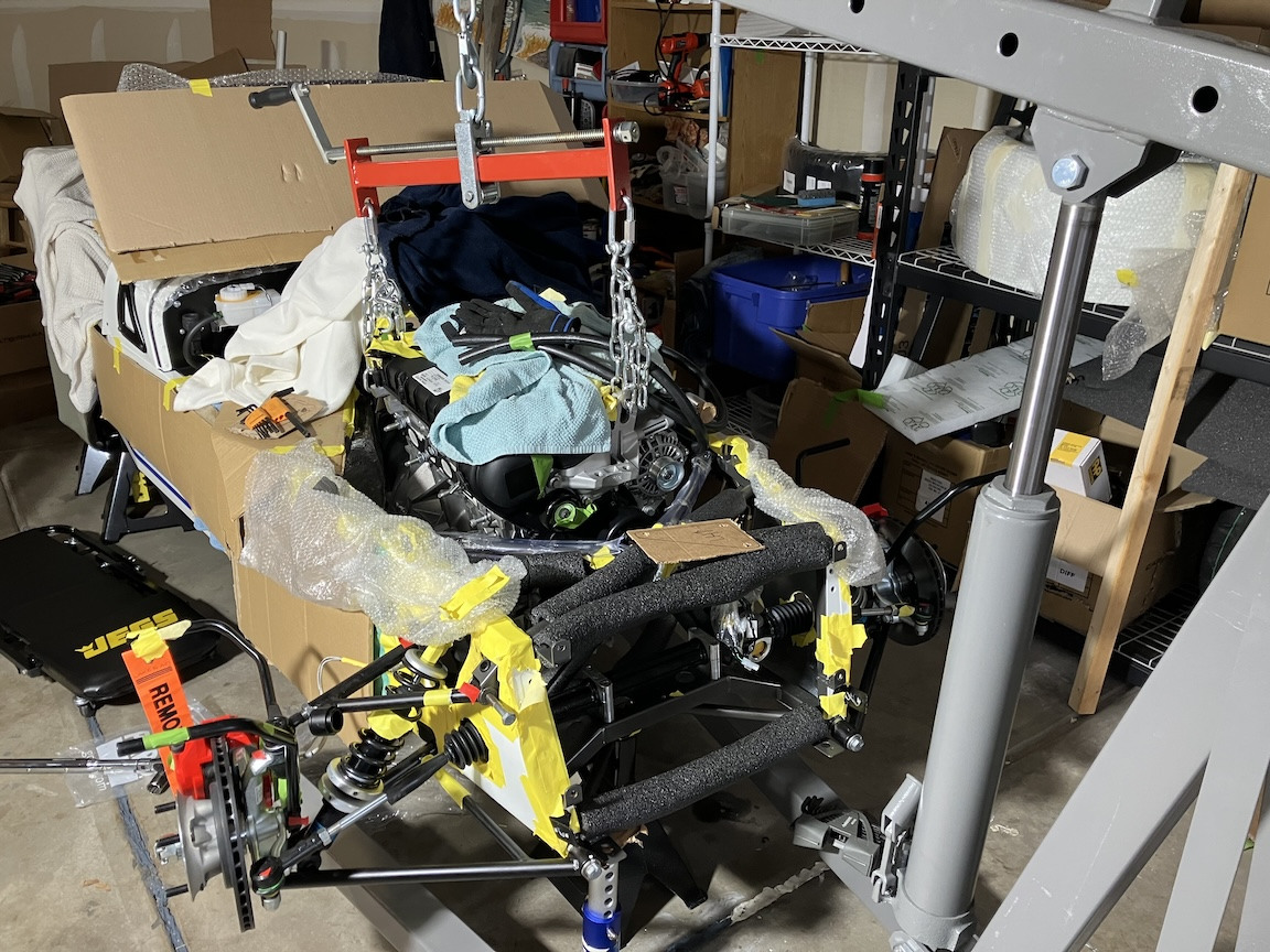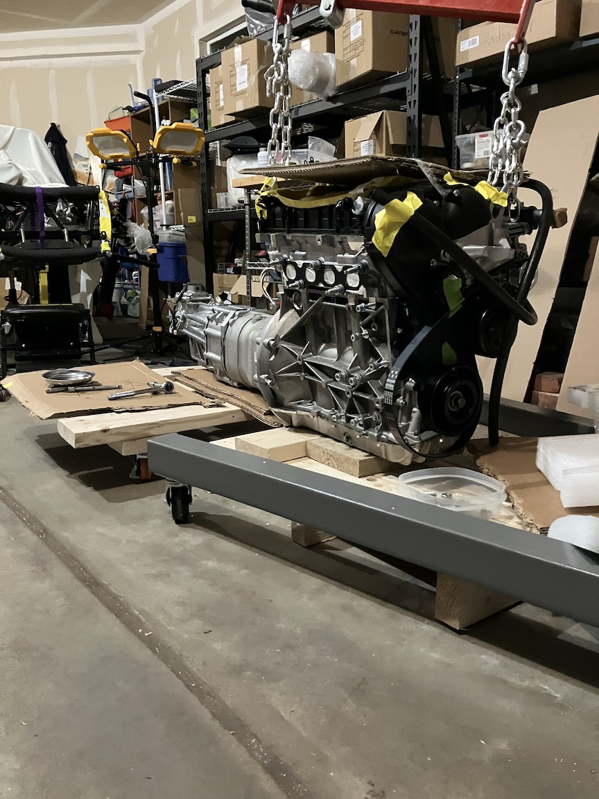 Engine prep I'd seen different recommendations about what peripherals to remove from the Sigma engine to make it easier to fit into the chassis (belt tensioner, alternator, starter). In my case, the only item I removed was the belt tensioner. That turned out to be enough. The combination of the engine hoist and the cart for the transmission worked out well. I'd considered just renting the hoist for the engine-install day, but I decided to buy a very lightly used one. I'm glad I did. I've now used it for multiple tasks in addition to the engine install, such as lifting the chassis out of its crate, repositioning in on the jack stands and assisting with the engine prep.