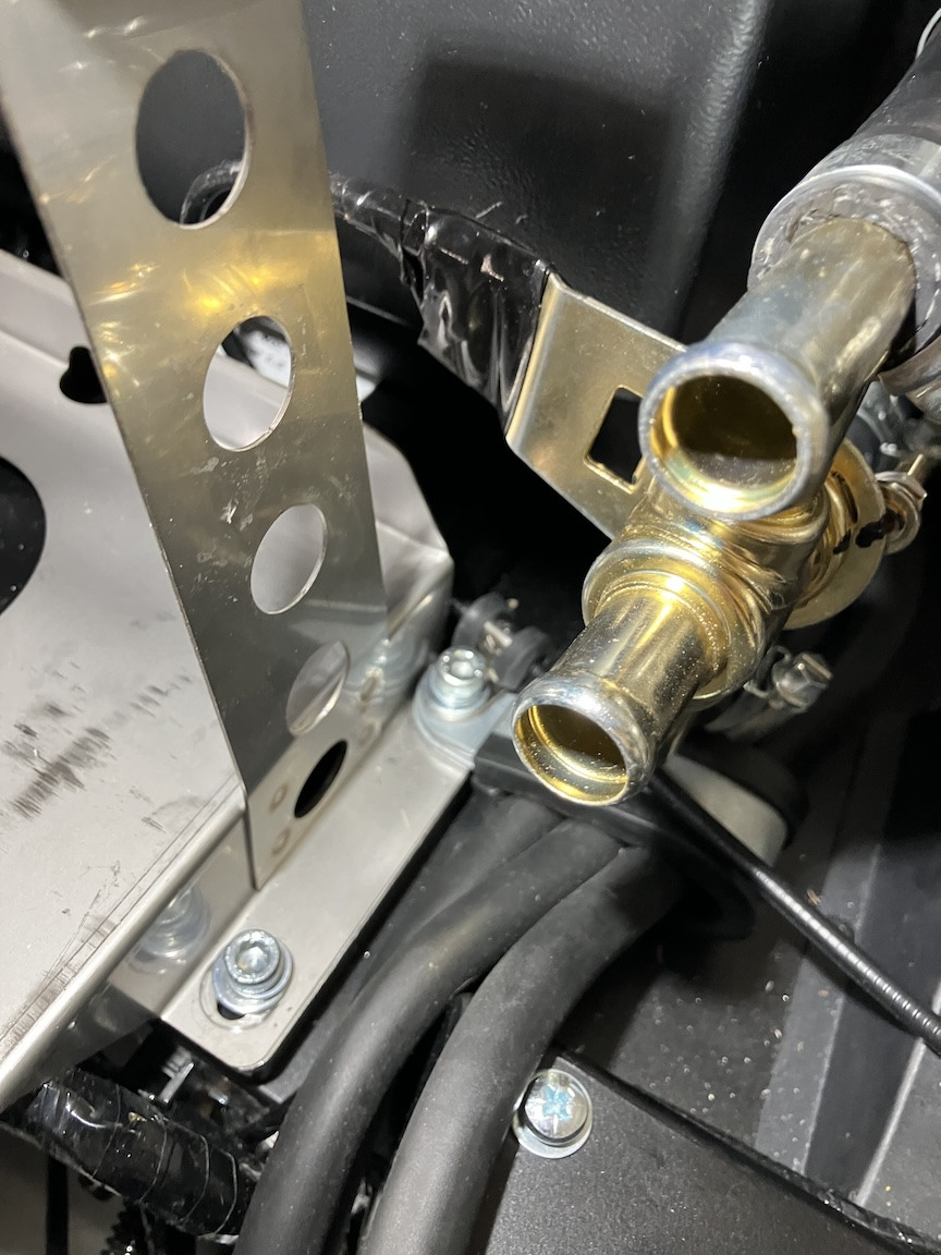 I added an adel clamp attached to the battery tray bolt to help anchor the heater cable. I also wrapped some silicone tape around the portion of the heater valve, where it looked like it might rub against the back of the battery.