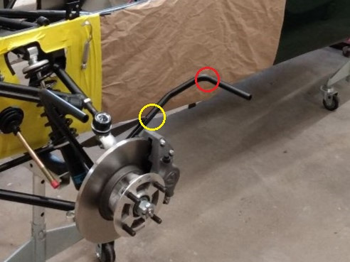 Looks good Charlie, but I think your concern of rubbing on track will come true. When I went to 13" wing stays I had very little clearance between the tire and the stay and knew that on track they would rub. I had the fenders off and was able to make two bends to get enough clearance where it doesn't rub. The first bend was in the area circled in yellow to get enough clearance on the angled section of the stay to the tire. I think I ended up with about a 1/4" of clearance. I was able to bend that relatively easy by hand using an aluminum drift stuck in the end of the wing stay. The second bend was made in the area circled in red to get the top surface of the stay parallel to the tire tread. I had to put a block of wood between the tire and the angled portion of the wing stay to maintain the clearance. I used the same aluminum drift stuck in the end of the wing stay and bent the top section back down to get that surface parallel to the tire tread. At first I thought I was going to have to heat up the stay to make the bends, but it ended being not too bad of a job just doing it by hand. It did take a fair amount of time to bend all (4) wing stay sections though. My wings are held on with cable ties and those bighead fasteners so that made it a lot easier to remove the wings and bend the stays. You could probably do it with the fenders still attached but I'm sure it would be a lot more difficult. Hope all this makes sense. Hoosiers will definitely be a little wider than the R888R's and will reduce the clearance even more so keep that in mind.