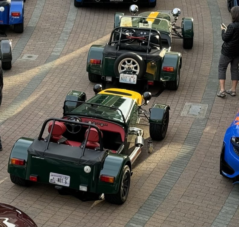 Today was British Car Day at our local cars & coffee event. The six Caterhams that showed up included an older crossflow car with clamshells, a Roadsport SV, a 420S SV, a 420R, and two CSRs, although only one is pictured. I did find it interesting that two owners had the same idea for a personalized license plate; I wonder who got theirs first?