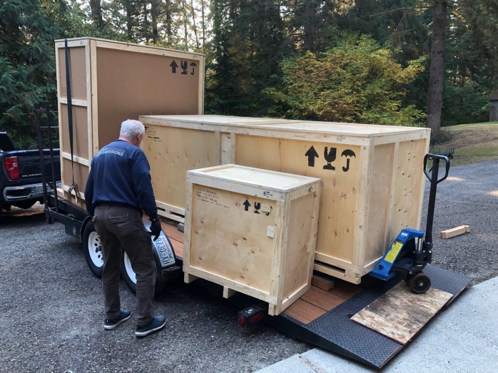 I went with option 3: my dealer is local to me and had the crates loaded onto a trailer then we used two pallet jacks to remove them and position them in the garage. If you have a few people to help, then using either a box truck or trailer and breaking down the crates in situ might be the cheapest and easiest method. I have dimensions and weights of the three crates if you need them. -John -
