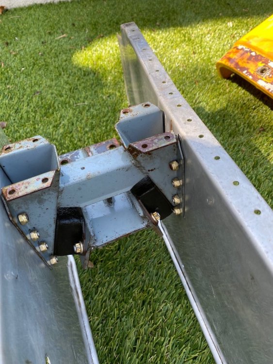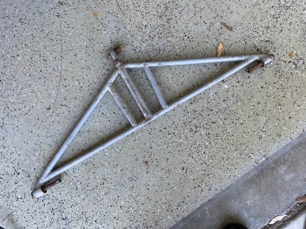 Just a selection of todays unloading/unpacking. The frame needs work, serious work, but it’s far from some I’ve seen that ended up beautifully! Some of the sheet Aluminium is not bad, and some will need to be replaced. Then there will be the paint Vs polish discussion . . . The rear lower frame looks a bit rough and might need to be remade or at least repaired. The front suspension seems to be in good shape. There is an original fuel tank and radiator although the rad has a modification I’ve not seen before. Ian SoCal Front suspension seems complete and in good shape. A bit rough and will need to be repaired.