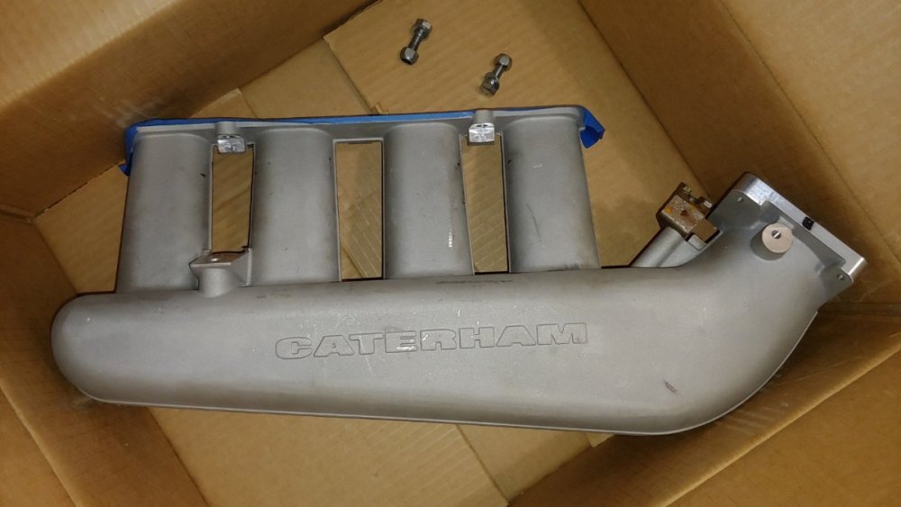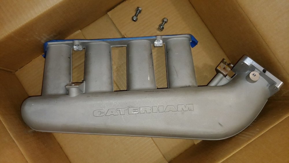 Caterham cast aluminum intake manifold and throttle ("butterfly") valve for four cylinder Ford Duratec 2.0 liter motor. Removed from a 2010 S3 R400 Superlight at about the 2,000 mile mark. The engine was upgraded to roller throttle bodies using a different manifold. Both parts are new in appearance, as evidenced in the photos below. $250 plus shipping for both. Bruce 810-938-1010