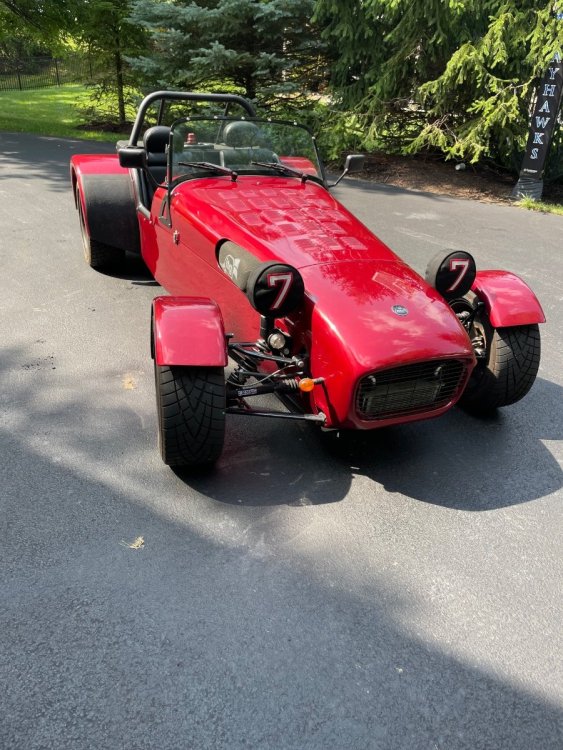 Anaximander seems perfectly normal to me:). I did look at the car today and it’s the real deal. Some highlights. It was commissioned and first owned by George Hilliard(sp?). George was probably on this Forum at one point. I know he participated in the 2005 Southwest Sevens event. But not necessarily in this car. Anyhow, his name is familiar to me. This Birkin seems to have been touched by the various speed gods. Built by Eddie Archer, motor by FocusPower in NC, maintained by Pauls’ Automtive in Cincy. For those not familiar with Pauls, they entered and won the Grassroots Motorsport Ultimate Track car challenge a few years ago, beating out, among others, a NASCAR team. According to this Birkin’s owner, they rebuilt the engine and did all the maintenance work on the car. In my opinion, that means it was done to the highest standards. The car looks new, thanks to the repaint job. There are a few chips and the rear wings are chipped up, but not nearly as bad as 99% of most Sevens The motor pulled strong and there are no oil/coolant leaks. The owner has a lift so I was able to inspect the underside which was clean and dry. All wiring, hoses and tubing was neat and tidy and squared away. Nicer than any se7en I’ve owned. One of the most impressive moments on my ride (passenger only) was when we went over a series of big bumps and road irregularities and the car was nearly squeak/rattle free. It made big power above 4500RPMs. Sort of night and day difference with lower rpm’s. The rear suspension looks like the preferred version discussed above. I will post a picture later and people can determine for themselves. Issues: the car has a custom built interior which is truly lovely and remarkably comfortable, but it seems to leave the driver and passenger sitting way high, and 3-5”above the rollover bar. A proper race seat would likely fix that? Or it may need a taller rollbar? It doesn’t have a weather package. The passenger seat belt didn’t retract. No idea about the driver’s. Tires have lots of rubber but not sure about age. They are 225 in back and 195 front, on 15” wheels. Summary: A like new, but older Birkin with an impressive refurbishment and strong engine. Is it worth $24K? I have no clue. Though if I were in the market I wouldn’t hesitate to pay that. If it were a Caterham it would probably be a $35K car. It goes on Cars and Bids Monday, unless someone buys it in the meantime. So we should know it’s value soon:)! -