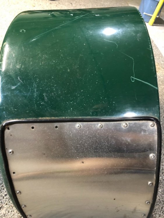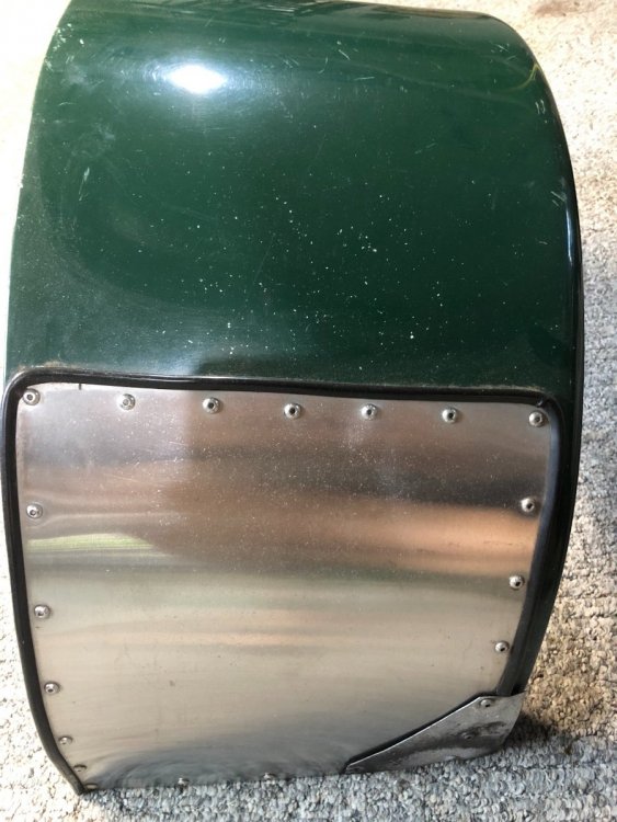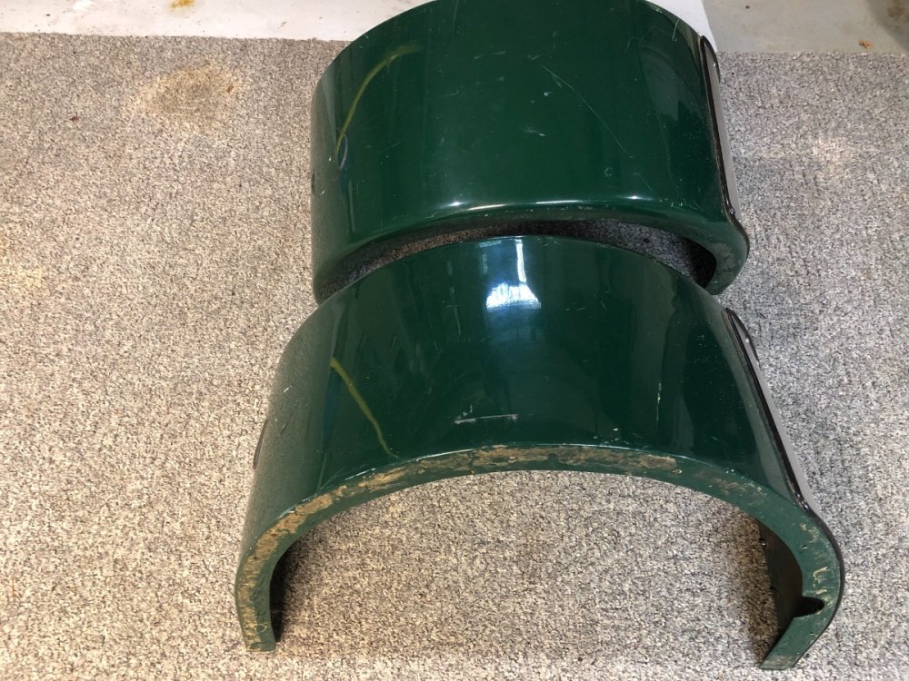 These are fiberglass Caterham rear fenders, with metal stone guards. Yes the event is a long way from you! But, they do give recognition to the person who travels the farthest and you would be a lock:). Not sure what wheel/tire would fit but they are a lot bigger then my standard Caterham rear fender, which can accommodate a 225/45-15 tire with no problem. The standard Caterham rear fender(aka: wing) is 11&1/2” wide and this is 2” wider, so 13&1/2.”This is 28&1/2” at the bottom opening and standard is even larger at 30”, per the Caterham parts store. I can’t explain why this is smaller at the bottom. These are not listed so maybe a discontinued item? FWIW: New rear wings are listed at $165 plus shipping from the UK, but listed as out of stock.