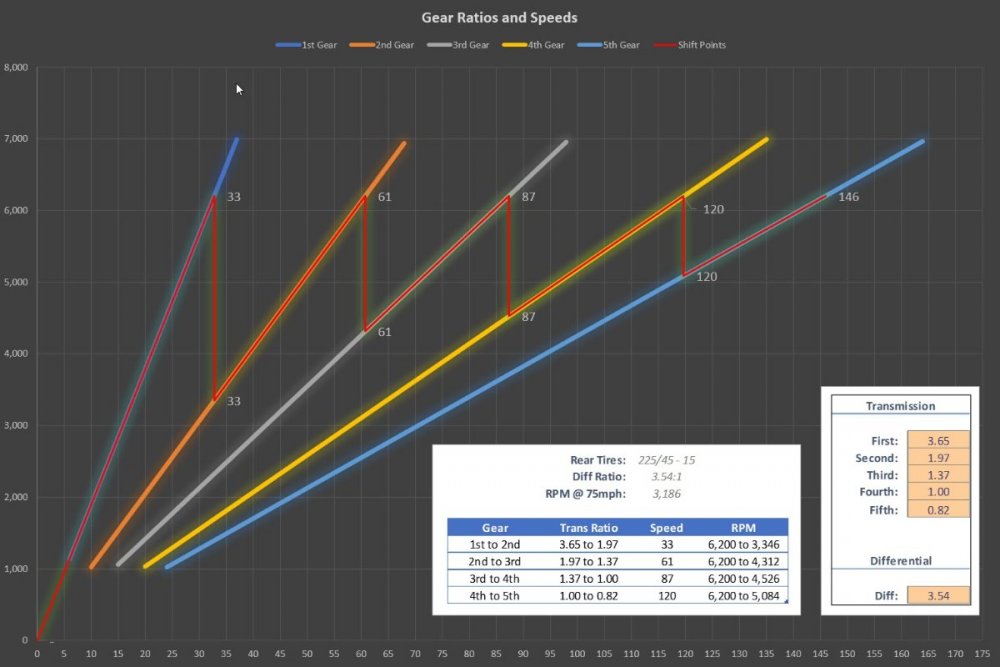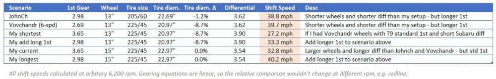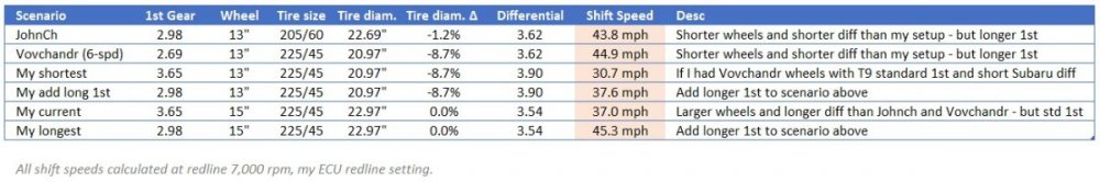5. Great points about gearing! Thanks for the sample values you guys are using... TLDR: My standard short 1st gear isn't quite as bad as it could be because I have larger wheels and a longer diff gear than both JohnCh or Vovchandr. But yes, I could get even longer (actually the longest of all) by choosing the long 1st gear option (long 2.98 rather than 3.65). I had decided that the money for a long 1st wasn't worth it for me, but maybe I'll regret the decision later ? My taller tires and longer diff gear also make highway cruising rpm a bit lower which I had read some people whish they had for a quieter experience. Interestingly for comparison, at 75 mph Vovchandr 6th gear shows 4,642 rpm and my 5th gear shows 3,186 rpm. Vovchandr's top gear (6th) is a 1:1 and my top gear (5th) is an overdrive 0.82:1. Detail: The following is a bit long and meant for me to document my thought process, it's not meant to prove right/wrong as you guys have much more experience and knowledge about all things se7ven, and I do appreciate the dialog! It's also meant for future readers that are also learning and 'getting up to speed' with gearing When calculating shift points, i.e. how fast the car goes in a specific gear when getting to a specific rpm and needing to shift into the next gear, three factors are used. Transmission gearing (a different ratio for each gear) Rear differential gear (a constant value while driving) Tire/Wheel size (a constant value while driving) short - refers to a large gear ratio, which results in slower speeds at same rpm long (tall) - refers to a small gear ratio, which results in faster speeds at same rpm I ran some scenarios using JohnCh and Vovchandr numbers as well as my own using my own spreadsheet (so hopefully they are accurate). I have slightly different gear options since my Birkin transmission and differential aren't the same as Caterham. My setup: Ford T9 transmission with standard gearing: 3.65 (1st), 1.97 (2nd), 1.37 (3rd), 1.0 (4th), 0.82 (5th) Subaru R180 Limited Slip Differential: Choice of short 3.90 or long 3.54 By the numbers I'm in the middle of possibilities as my overall gearing is made longer by going with 225/45 - 15" wheels and I opted for the longest rear diff gear at 3.54 (as opposed to my other option of 3.90 with the R180 LSD). But I'd be much worse off with Vovchandr's 13" wheels and my other option of a shorter 3.90 rear diff. For comparison sake, I assumed a spirited shift point from 1st to 2nd is 6200 rpm. The results of the different scenarios are: So, if had wheels like Vovchandr and didn't choose any long gearing options, I'd be down at 27.2 mph shift speed. Since I have larger wheels and a longer rear diff gear, my current build is at 32.8 mph shift speed. If I did go with a longer 1st gear option, I'd have the longest overall gearing with a shift speed of 40.2 mph. Maybe incorrectly, but I decided the optional cost for upgrading to a long 1st gear wasn't worth the 6-7 mph change in shift speed. If I'm wrong, then I'll have to live with it for a while until I can upgrade the gearing -b