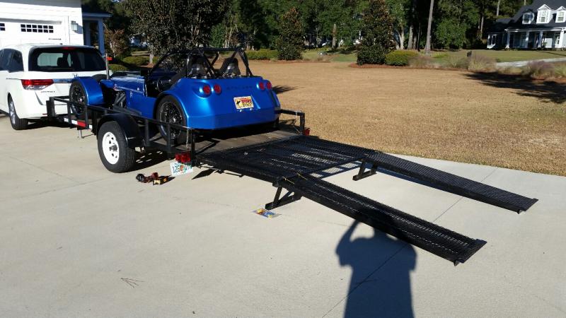 6. Sold my M-Spec Storker so I have a like new single axle (3500 pound) 6x12' trailer with custom ramps designed to put your seven on and be able to tow it with a vehicle that has a 3500 pound towing capacity. The trailer weighs approximately 1200 pounds with the custom ramps and has a total payload capacity of 2128 pounds. The custom ramps were professionally fabricated to allow a very shallow ramp and have built-in strong metal supports. The ramps have holders welded onto the trailer to be stowed on the outsides of the trailer securely without tie downs while transporting your car. The custom ramps do not protrude out farther than the wheels. The fold down regular ramp has been reinforced for your car and is drilled for bolts to temporarily bind to the custom ramps for a secure setup. All three tires are top of the line trailer radials. The trailer tracks beautifully.