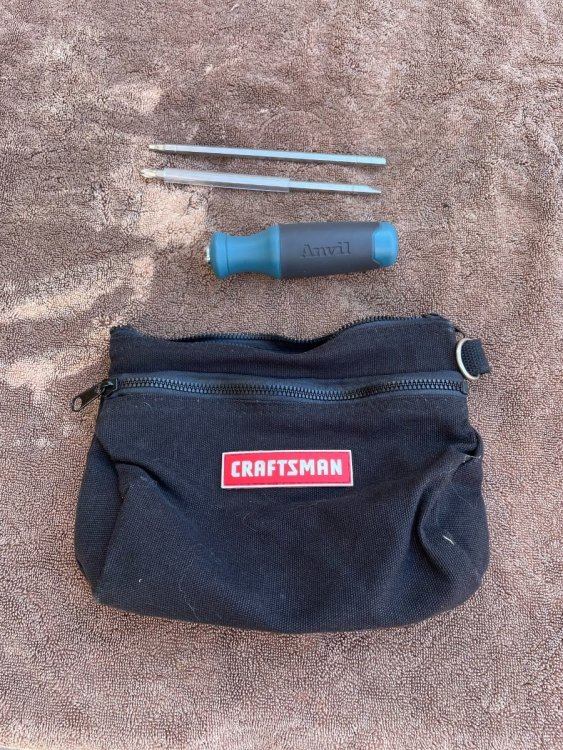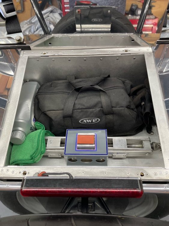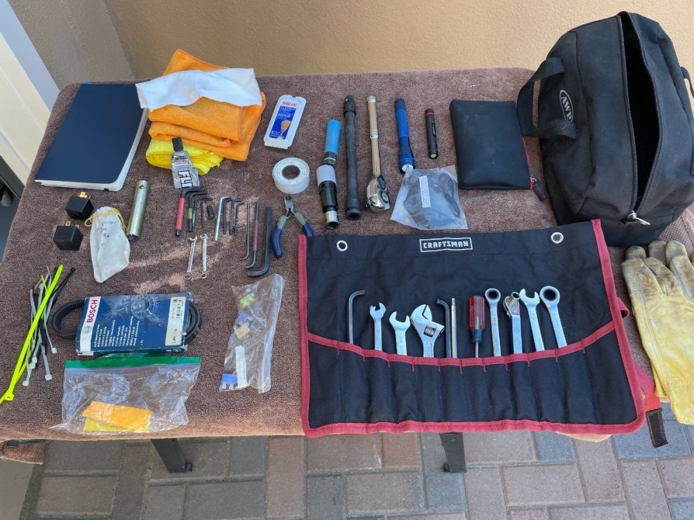 I have given much thought to this topic and will share the "anal-retentive" driver's boot contents. If I'm going to carry that spare tire on the back of the car, I definitely bring a scissor jack. I use an aluminum one from a Porsche 944 (3 lbs 6 oz) to which I have welded a section of 19mm coupling nut. This allows me to use the same socket that I use for the lug nuts. This is secured in the boot with an aluminum bracket. I also carry the following: ½" ratchet 6"extension for same 19mm deep socket lug nut adapter spare ribbed belt for the alternator (4 rib x14x793). I have been told that this is the smallest 4 rib belt made, therefore unobtainable on the road. special tool for the low profile oil filler cap a variety of allen wrenches, many shortened as appropriate for their application .032 safety wire small wire cutters various quick ties various wrenches in a fabric roll-up a couple clean microfiber towels and a small tube of metal polish bandaids two LED flashlights 2 spare relays my notebook that contains all of the specification, part numbers, etc pair of leather work gloves swell as a pair of nalgene gloves The top picture shows a small bag that I keep behind the seat. It hold a collapsable phillips head screw driver for the quarter-turn fasteners that secure the boot panels. On the longer trips, I carry a quart of oil and a dipstick. I use a section of ss wire as a dipstick so this simply coils up in the bag. Probably too much but it is my firm conviction that my car has been reliable only because I carry all this stuff. 5,500 trouble free miles so far... -