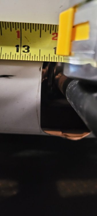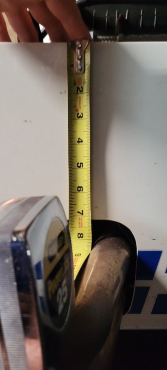 On my SV Duratec, it looks like from the top of the chassis rail (including the skin) to the exhaust opening is 7 1/8" and the horizontal gap from the rear portion of the A-arm cutout is 13 9/16".