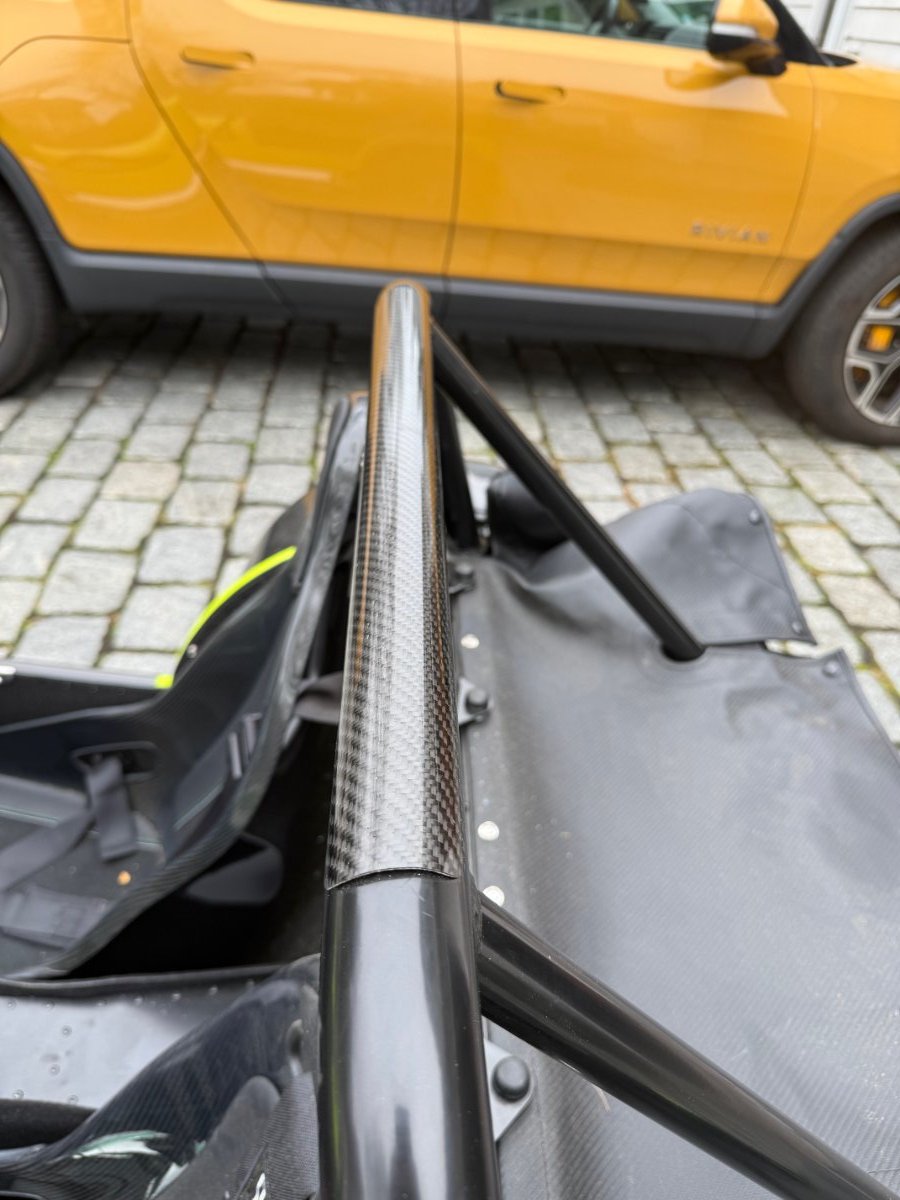 OK ... now finally have the car running. Moving on to Pickle proof the car, I am notorious for scratching and denting things, so I need protect the car from myself! First off, the rear roll bar, noticed on previous 360, passengers (Those mad enough to get into my 'Orange Coffin') would instinctively grab the roll bar and if they were wearing rings they would scratch it. So, a handy-dandy bit of carbon fiber with double sided tape (Because this car really does not have enough CF already ) And then some additional self-adhesive foam to the hood. (And to keep the cat engaged) Next will be adding some PPF in certain places.