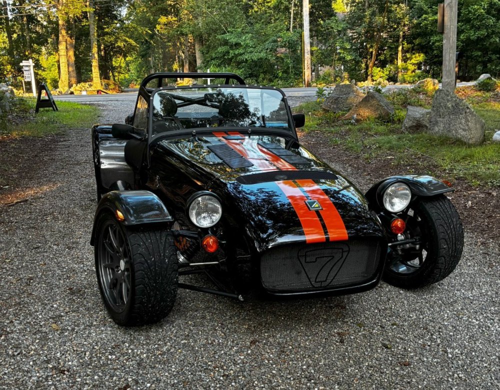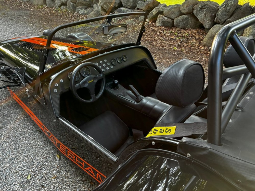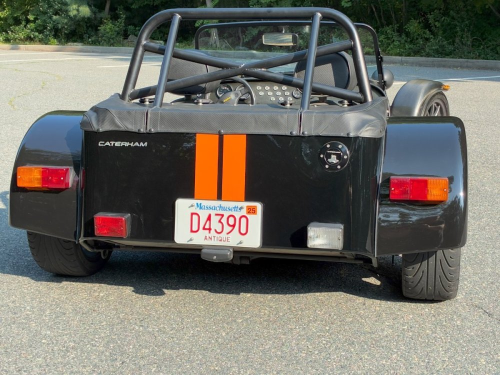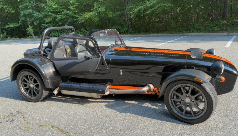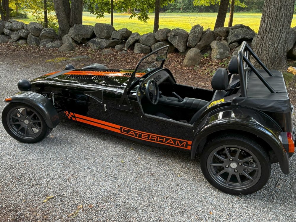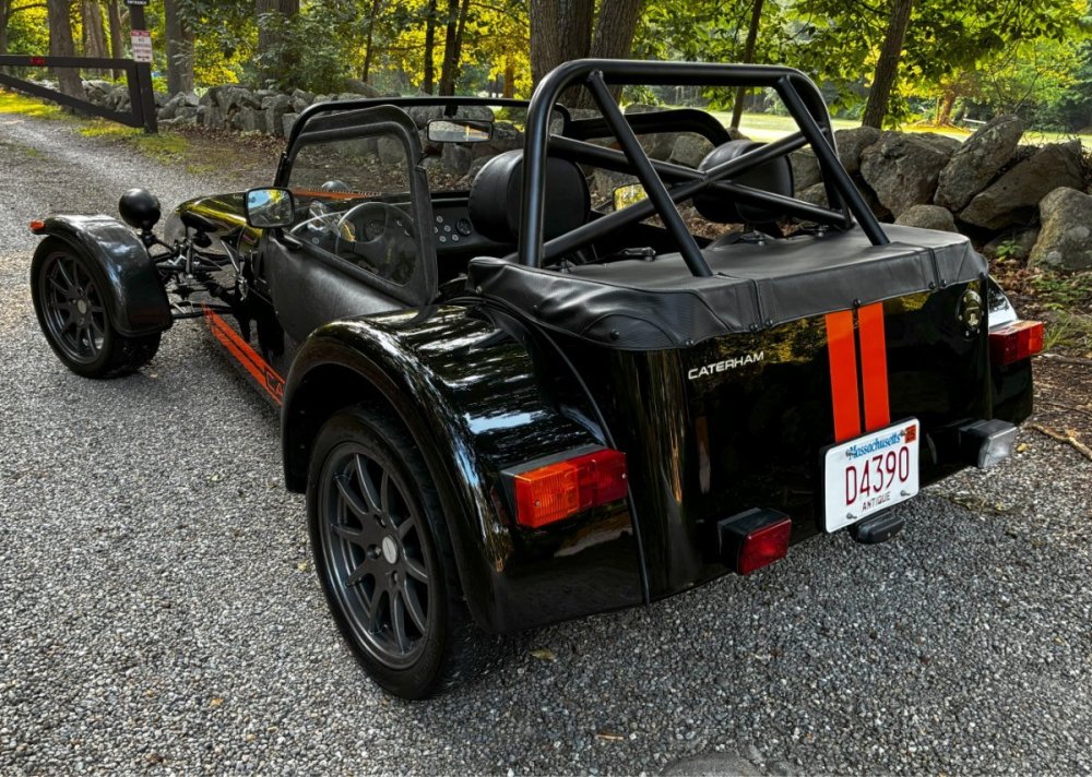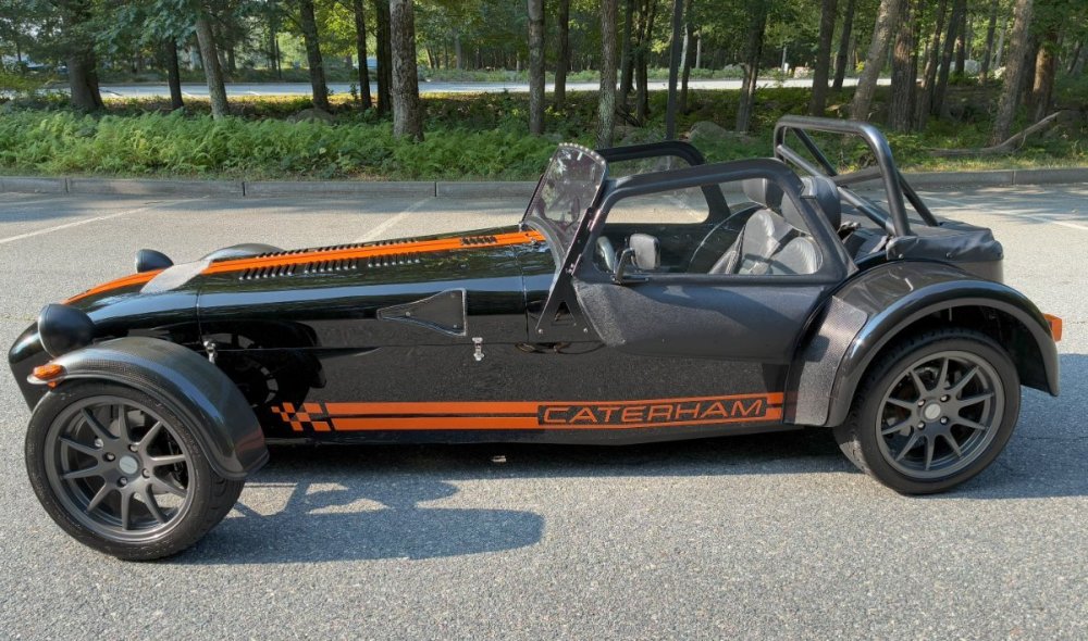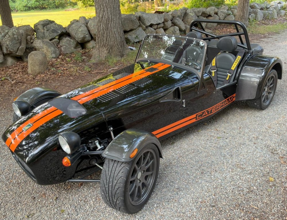 Description This Caterham Seven 480 SV was built by Superformance in California in 2016 and was purchased from the original owner in 2020, and it is powered by a 2.0-liter Duratec inline-four linked with a six-speed manual transmission and a limited-slip differential. Finished in Black with Orange stripes, the car features a carbon-fiber dashboard and front fenders as well as a wider cabin with lowered floors. Equipment includes a Caterham roller-barrel intake assembly, a dry-sump lubrication system, a removable soft top and doors, carbon-fiber-patterned upholstery, a MOMO steering wheel, a heater, 15” alloy wheels, Bilstein coilovers, and four-wheel disc brakes. This Caterham is now offered by the seller with a clean Massachusetts title listing and only 1253 miles . The aluminum body features a louvered hood with a NACA duct on the left side. Exterior details include carbon-fiber front fenders and stone guards as well as a heated windshield, a side exhaust pipe, a roll bar, a billet fuel filler cap, a half hood, a full roof, and removable doors with integrated armrests. The SV body provides a 15% wider cabin, which houses bucket seats trimmed in carbon-fiber-patterned upholstery that also covers the transmission tunnel. The MOMO steering wheel is mounted to a quick-release hub and fronts Caterham-branded instrumentation consisting of a 260-KM/H speedometer, a tachometer, and gauges for oil pressure, coolant temperature, and fuel level. The digital odometer reportedly indicates 2018 kilometers (1253 miles) DRIVETRAIN The 2.0-liter Ford Duratec inline-four was originally equipped by Caterham with a Cosworth roller-barrel intake assembly, forged conrods and pistons, CNC ported head, uprated camshafts and valve springs, as well as a dry-sump lubrication system and a stainless-steel four-into-one exhaust header. The drivetrain is as simple as the rest of the car. The 480 employs a 2.0-liter, Duratec four-cylinder supplied by Ford that makes 237 horsepower and 151 pound-feet of torque. With its super-low curb weight of just 525 kg (1,157 pounds), that 237 horsepower really packs a punch. Sixty mph in just 3.4 seconds. The real beauty of this engine is that it revs to 8,500 rpm. STATISTICS Caterham Seven 480 – Drivetrain Details Engine 2.0 liter Ford Duratec Max Power 237 HP @ 8,500 RPM Max Torque 151 LB-FT @ 6,300 RPM Weight 525 kg (1,157 Pounds) 0-62 mph 3.4 seconds Power-to-weight 457 ps-per-tonne Top speed 140 mph First Registered 8/18/2016 Spends Winters in storage on blocks & with tires off until late Spring. It has never seen rain. Mansfield, MA Now $58,500. (reduced from $62,500)
