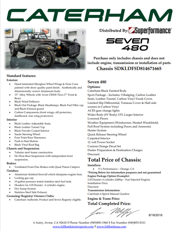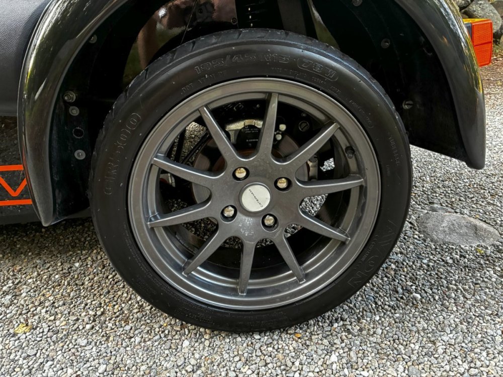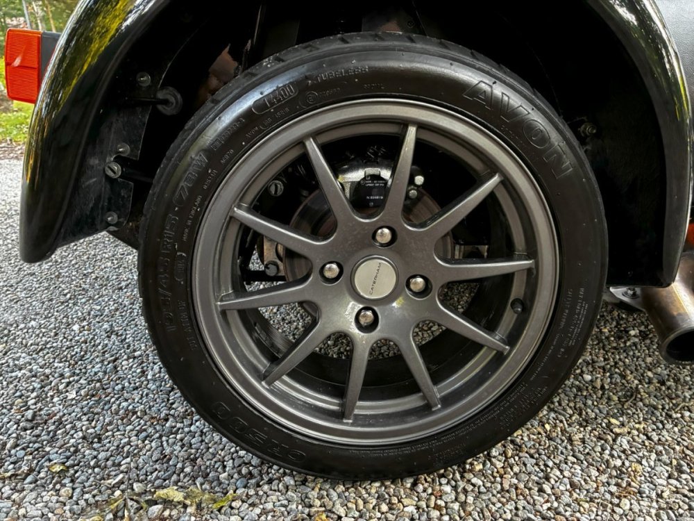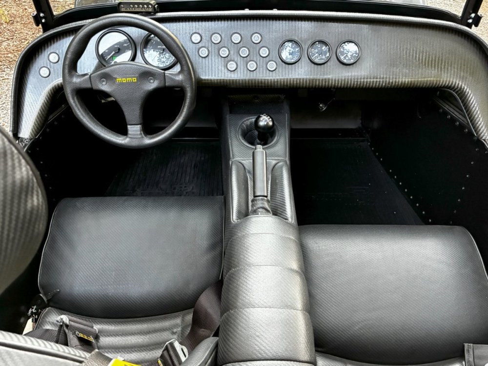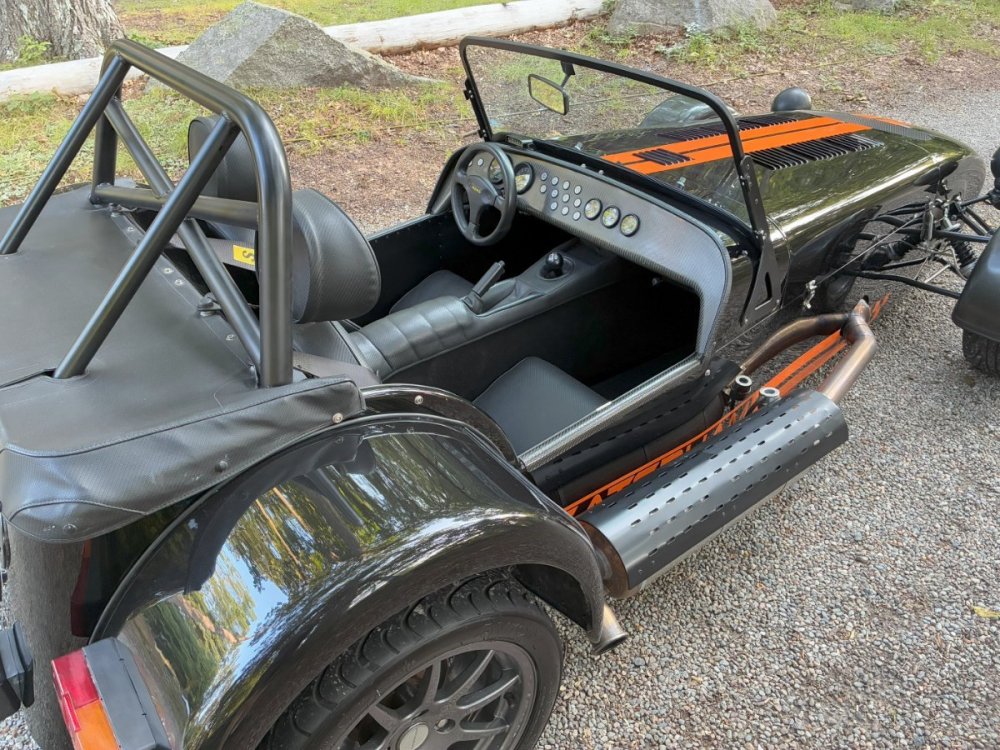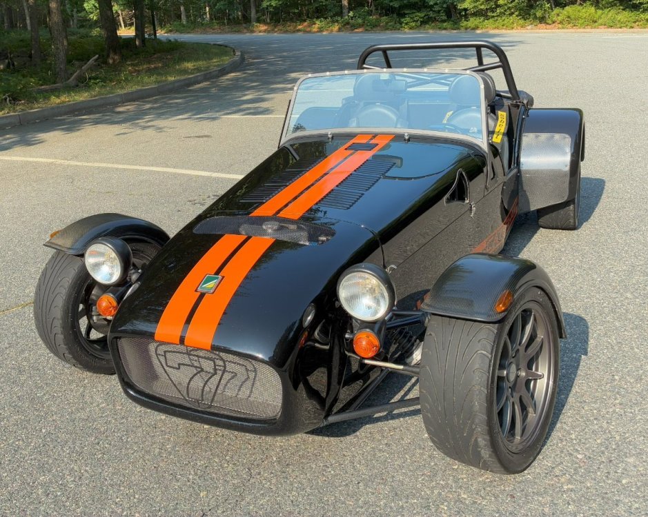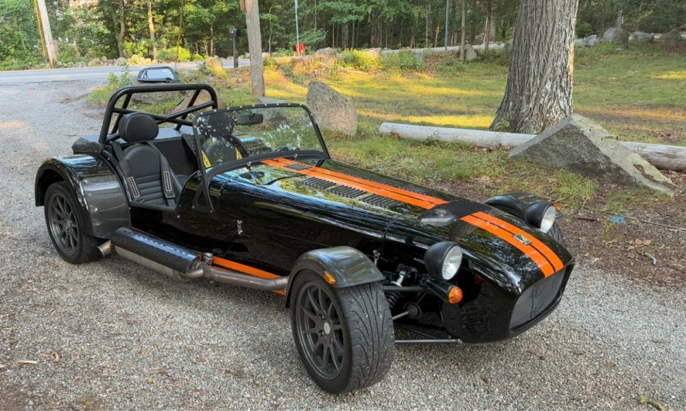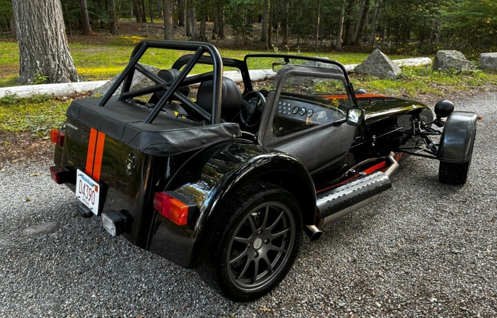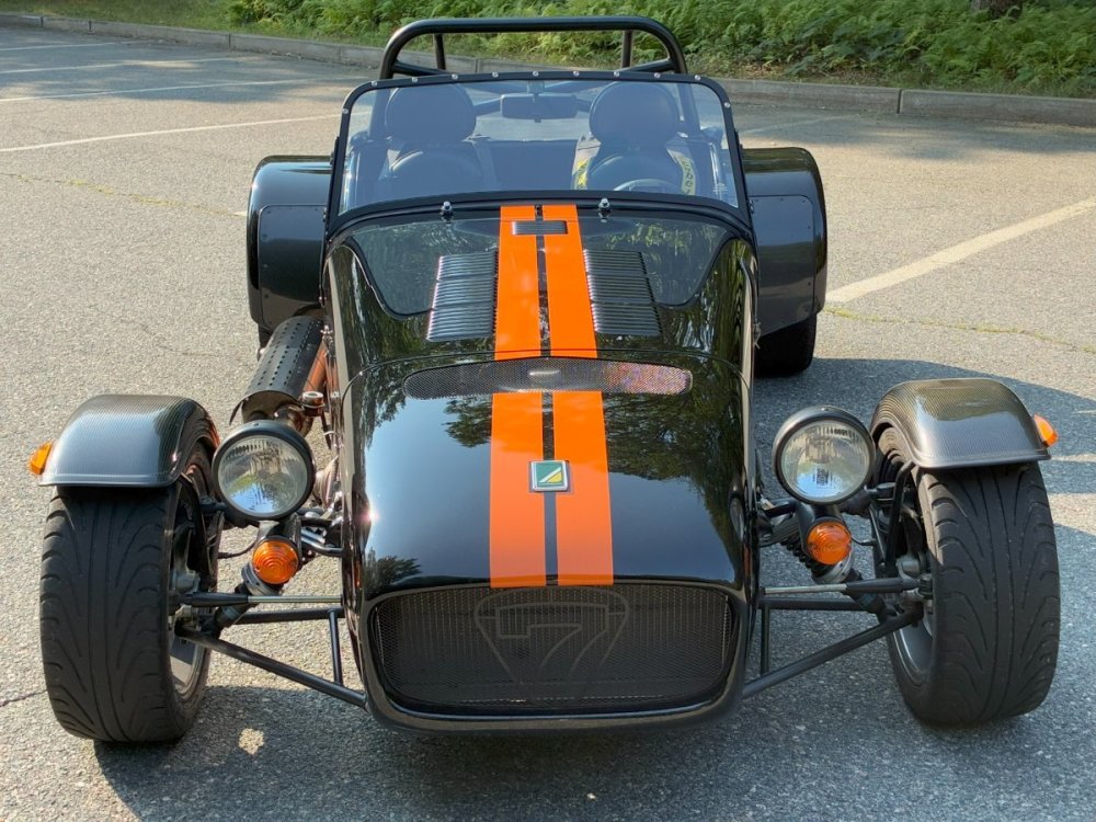 Description This Caterham Seven 480 SV was built by Superformance in California in 2016 and was purchased from the original owner in 2020, and it is powered by a 2.0-liter Duratec inline-four linked with a six-speed manual transmission and a limited-slip differential. Finished in Black with Orange stripes, the car features a carbon-fiber dashboard and front fenders as well as a wider cabin with lowered floors. Equipment includes a Caterham roller-barrel intake assembly, a dry-sump lubrication system, a removable soft top and doors, carbon-fiber-patterned upholstery, a MOMO steering wheel, a heater, 15” alloy wheels, Bilstein coilovers, and four-wheel disc brakes. This Caterham is now offered by the seller with a clean Massachusetts title listing and only 1253 miles . The aluminum body features a louvered hood with a NACA duct on the left side. Exterior details include carbon-fiber front fenders and stone guards as well as a heated windshield, a side exhaust pipe, a roll bar, a billet fuel filler cap, a half hood, a full roof, and removable doors with integrated armrests. The SV body provides a 15% wider cabin, which houses bucket seats trimmed in carbon-fiber-patterned upholstery that also covers the transmission tunnel. The MOMO steering wheel is mounted to a quick-release hub and fronts Caterham-branded instrumentation consisting of a 260-KM/H speedometer, a tachometer, and gauges for oil pressure, coolant temperature, and fuel level. The digital odometer reportedly indicates 2018 kilometers (1253 miles) DRIVETRAIN The 2.0-liter Ford Duratec inline-four was originally equipped by Caterham with a Cosworth roller-barrel intake assembly, forged conrods and pistons, CNC ported head, uprated camshafts and valve springs, as well as a dry-sump lubrication system and a stainless-steel four-into-one exhaust header. The drivetrain is as simple as the rest of the car. The 480 employs a 2.0-liter, Duratec four-cylinder supplied by Ford that makes 237 horsepower and 151 pound-feet of torque. With its super-low curb weight of just 525 kg (1,157 pounds), that 237 horsepower really packs a punch. Sixty mph in just 3.4 seconds. The real beauty of this engine is that it revs to 8,500 rpm. STATISTICS Caterham Seven 480 – Drivetrain Details Engine 2.0 liter Ford Duratec Max Power 237 HP @ 8,500 RPM Max Torque 151 LB-FT @ 6,300 RPM Weight 525 kg (1,157 Pounds) 0-62 mph 3.4 seconds Power-to-weight 457 ps-per-tonne Top speed 140 mph First Registered 8/18/2016 Spends Winters in storage on blocks & with tires off until late Spring. It has never seen rain. Mansfield, MA Now $58,500. (reduced from $62,500)