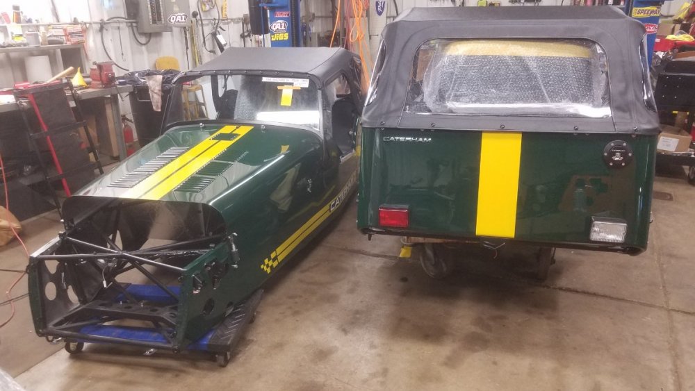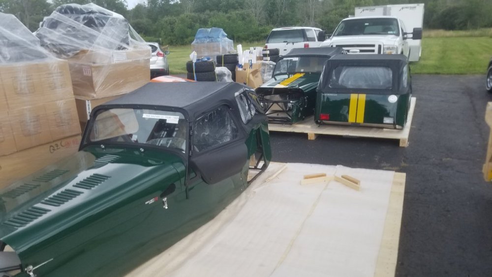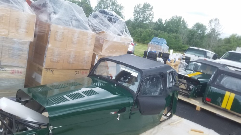Due to a customer's inability to take delivery we have a Caterham Seven 360S kit is available. It is spec'd with: SV chassis Limited slip diff 15" Orcus anthracite wheels with Avon ZZS tires Front ventilated rotors with quad piston calipers Uprated master cylinder Side screen armrests Track day roll bar Carbon fiber dashboard MOMO steering wheel with quick release Carbon fiber front cycle wings, unpainted Silver fuel filler cap Draper tool kit Vintage Green paint Painted "7" in grille, white Doubles stripes in Sunflower yellow White "CATERHAM" side lettering Map pocket LED headlamps Black leather seats And the standard 360 powertrain of 2.0 Duratec with five speed. This kit is at Dartford and will be collected for shipping next week. It will arrive at our shop in June (there is a serious worldwide delay in shipping due to container shortages and port delays) so it will ready for collection here or we can deliver or ship the kit. Currently if a new kit order was placed it would be 4th week of 2022 for build. We do have build slots for 2021 as we have placed deposits but this kit offers almost instant gratification! We will be pleased to quote delivery via our trailer or via commercial transport (we get a substantial discount from FedEx Freight and UPS Freight) so we can crate and ship anywhere. We will be pleased to quote this kit on application. Please contact rick@timemachinesauto.com or call 716.407.0975 400 (1).jfif