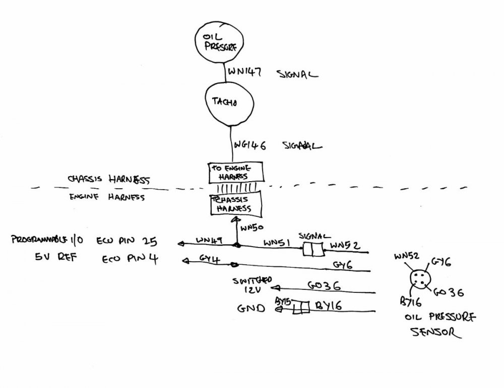 I’m pretty sure it’s an electrical wiring gremlin somewhere at this point. Here’s the electrical wiring for the oil pressure sensor… Not sure what the point of the 5V reference is, but the 5V, 12V and GND are testing ok. What I didn’t know until I researched the schematics is the feedback also goes to the ECU as well as the gauge (strangely via the tach), and also the unused connectors on the engine harness on the left side near the oil filter can be used to connect the oil pressure signal and a GND to something. The signal WN52 is reading 7-8V, which is not possible for a device that can only put out 5V, so there has to be a bad ground or something like that somewhere. Grrr.