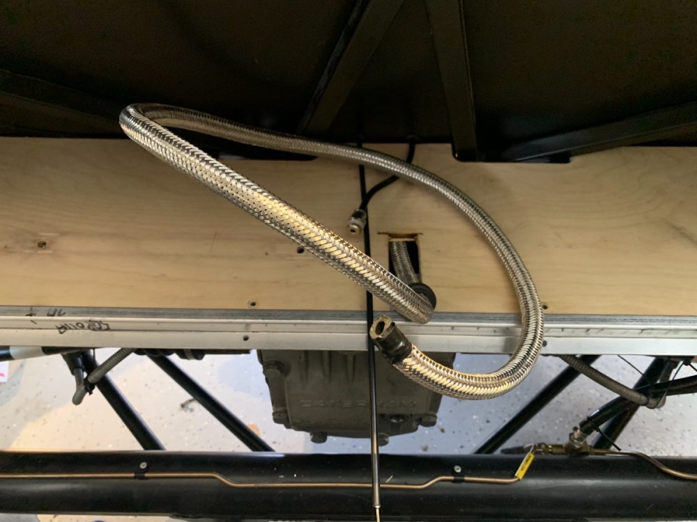 Some issues with the copper pipe that Caterham sent… 1. The rear exit looks fine except the connector goes back down which is odd… …it’s not the end of the world but will mean some hassle finding the right elbow/banjo connector to bring it back up and keep it away from everything else going on down below. Seems awkward. 2. Using this pipe means 4 connection points instead of 2. 3. Even though it’s installed in a pretty well protected area it would seem rational to want to put a protective cover over it. The old line was a crappy hard plastic tube with a shroud. I’m leaning towards using stainless braided flexible 7.9mm tube that will run directly from the tank t connector to the engine rail. Easy install and only 2 connection points. The tube is rated to 250F so should take the heat, and the braid should protect the tube from stuff hitting it. I checked the cover of the old fuel line and other than dust it’s in immaculate condition so I don’t believe there’s a particular risk damage from stuff flying around from the road.