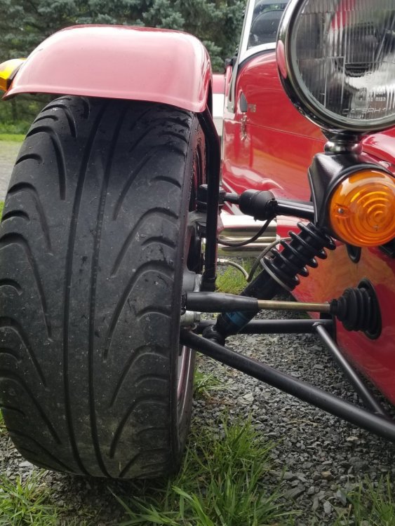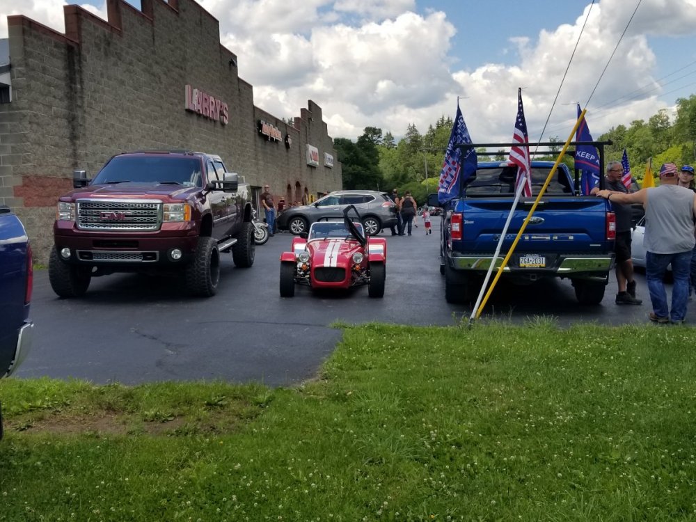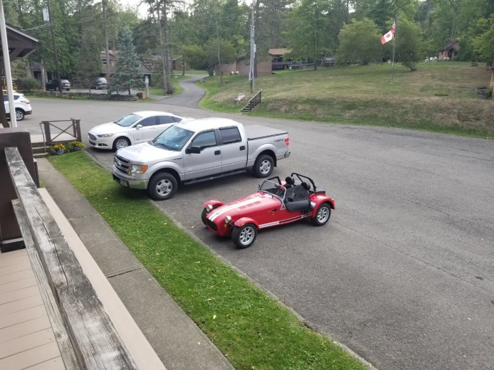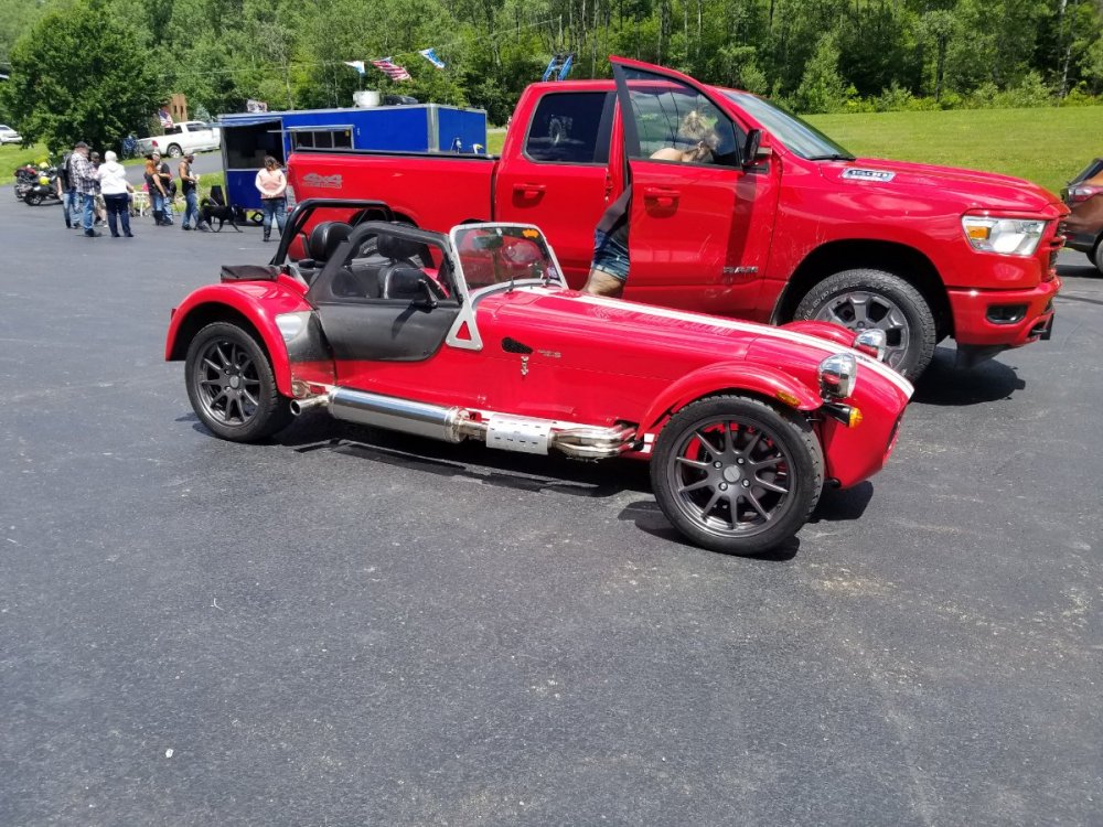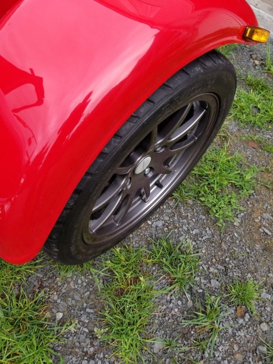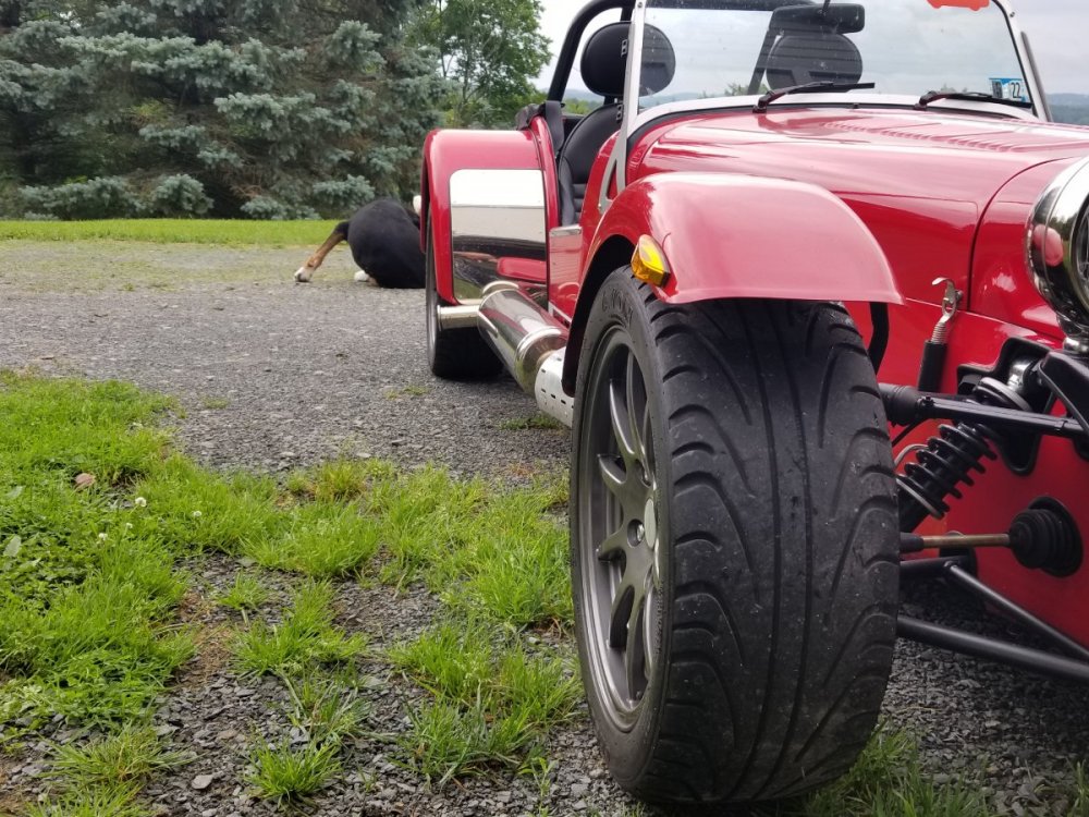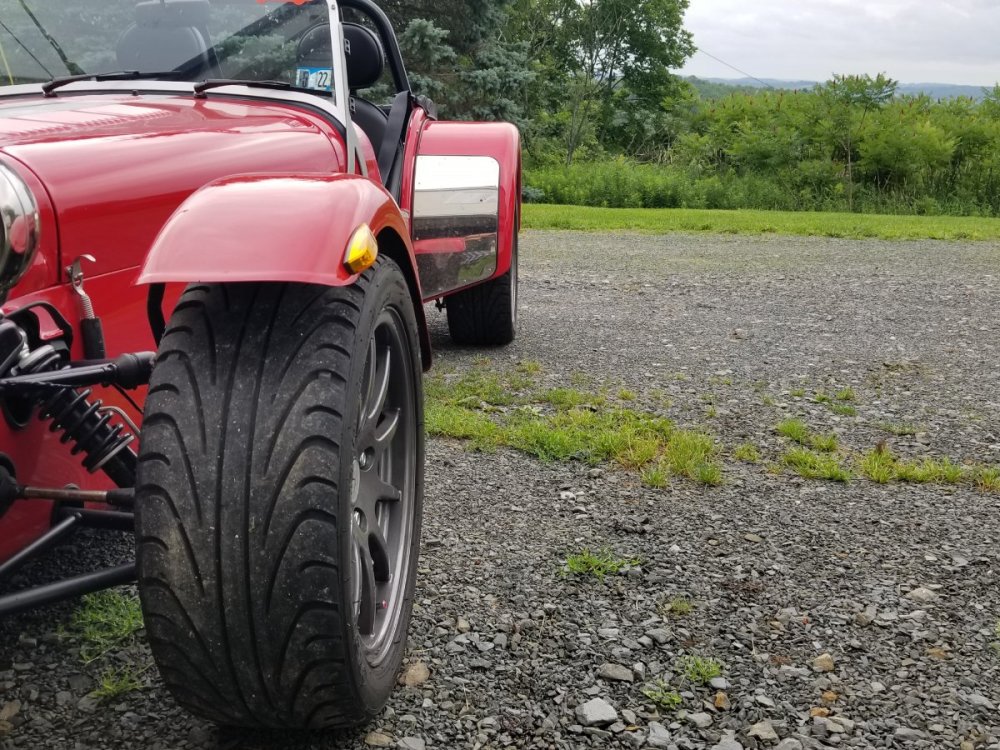 I finally got some decent weather to get my 7 out with the new wheels and tires I got from you Seb. They look and drive fantastic. Thanks Again, Kenny Also a very funny pic of my car inbetween two pickups... LOL -