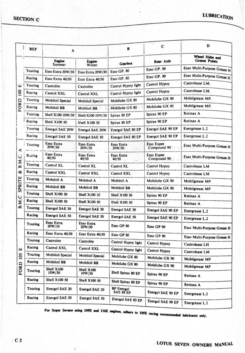 This should help with proper weights for all the fluids. The entire manual is in the library, should you need it. I've been using Redline motor oil, gearbox oil, and diff fluid for years in my Seven and Elan.