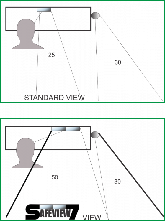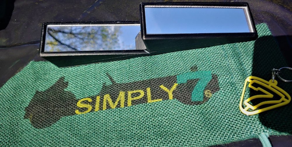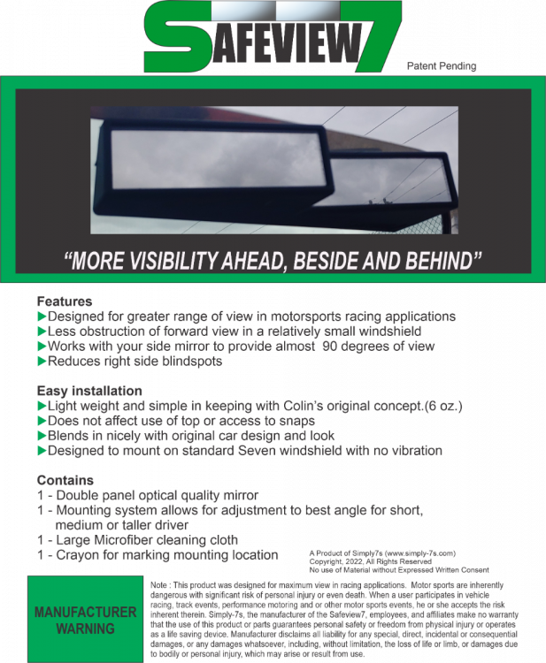 About a year ago, I was sitting in my Caterham behind a car at a light... heard a noise and looked in my tiny little mirror on the dash. I saw a landscaping truck with trailer with 4 people sitting in front, eyes wide and truck was in in full all 4 tire lockup skidding right for me. By the time I processed it... there was nothing to do but sit and brace myself. They stopped a few feet from my bumper. I had always been worried about getting hit in my light little car but I realized I needed to make a better mirror. I wanted to see more of what was happening around me so I could react instead of sit and watch a re-run of I love Lucy at the pie factory at the end of my life. LOL I went through many iterations and design changes, played with angles and tested them (in the way only a retired guy can do) and finally came up with a great mirror for Sevens (and smaller cockpit race cars). The Safeview7 mirror (Patent Pending) gives you more visibility to : the front by moving mirror to the right side of the cockpit, to the back including behind your head, and it works with the side mirror to allow tracking a passing car all the way up to where it is in your peripheral vision. This allows you greatly improved situational awareness, more time to react in an emergency and the ability to judge closing speeds and distances of the traffic around you. There is nothing like driving a Seven (I am on my 6th one...) but the Safeview7 does enhance that experience and give you a lot safer feeling than you get from a small dash or center of windshield mirror. Thanks for considering one of these for your car!