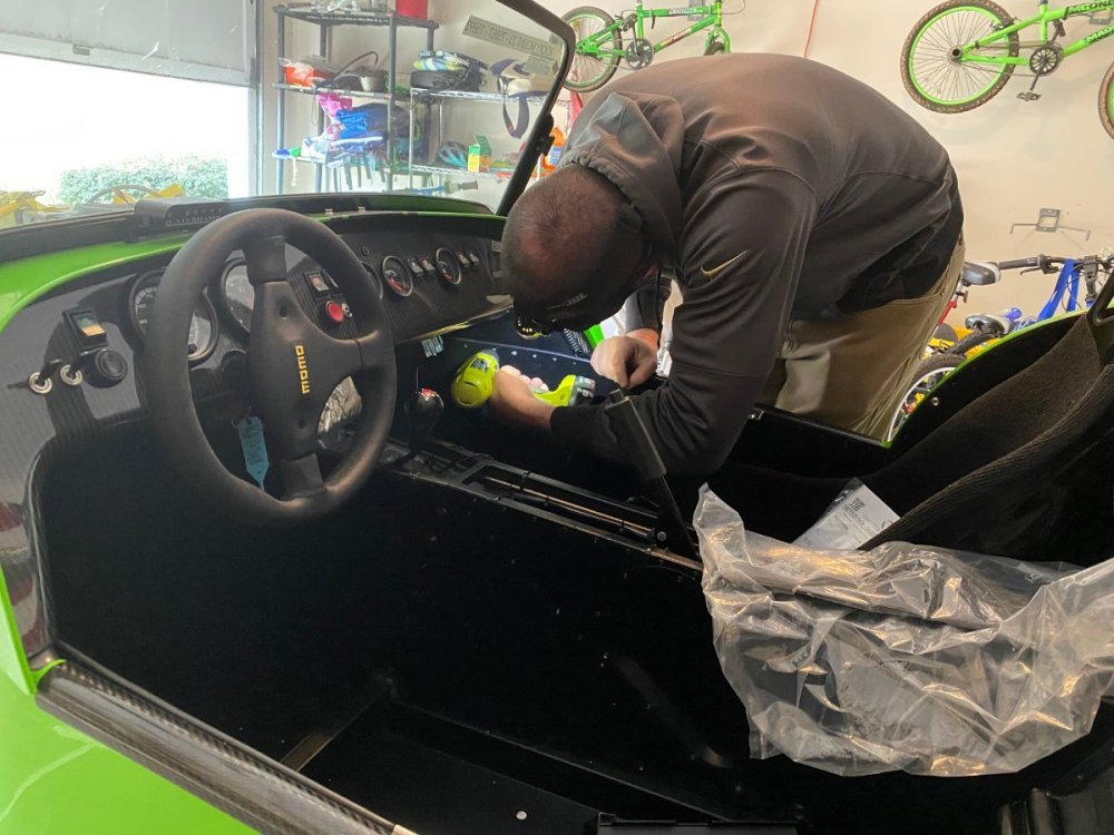 Seventh big build category: interior. This part has been fun. I ordered full carpets and have installed carpets on the tunnel, below the seats, and behind the seats. Carpet tape instead of spray adhesive was a good call (per advice of Josh Robbins with Rocky Mountain Caterham). Tunnel top fits as you would expect. Same with the gear shifter. I expected the knee plates to be hard. But they were not bad at all. I punched holes in the rubber, inserted the knee plates with a little firm pushing and bending, drilled as indicated in the manual (the holes on the knee plates don't line up at all as delivered), and screwed/riveted per the Ikea manual. I may have gotten lucky. The 12v lighter attaches to a wire in the passenger side, but there is still a stray wire that does not seem to attach to anything. I'll add it to my list of questions for Josh. There seem to be several of these orphaned wires. The one trick is for those with lowered floors and an adjustable driver's seat. You must bend the L shaped adjuster down before installation. Otherwise, the cross member will not allow you to move the seat backwards and forwards. Another question for the group: are the S3 tillets the same size as the SV tillets? I ask because mine seem very tight and the packaging label identifies them as S3.