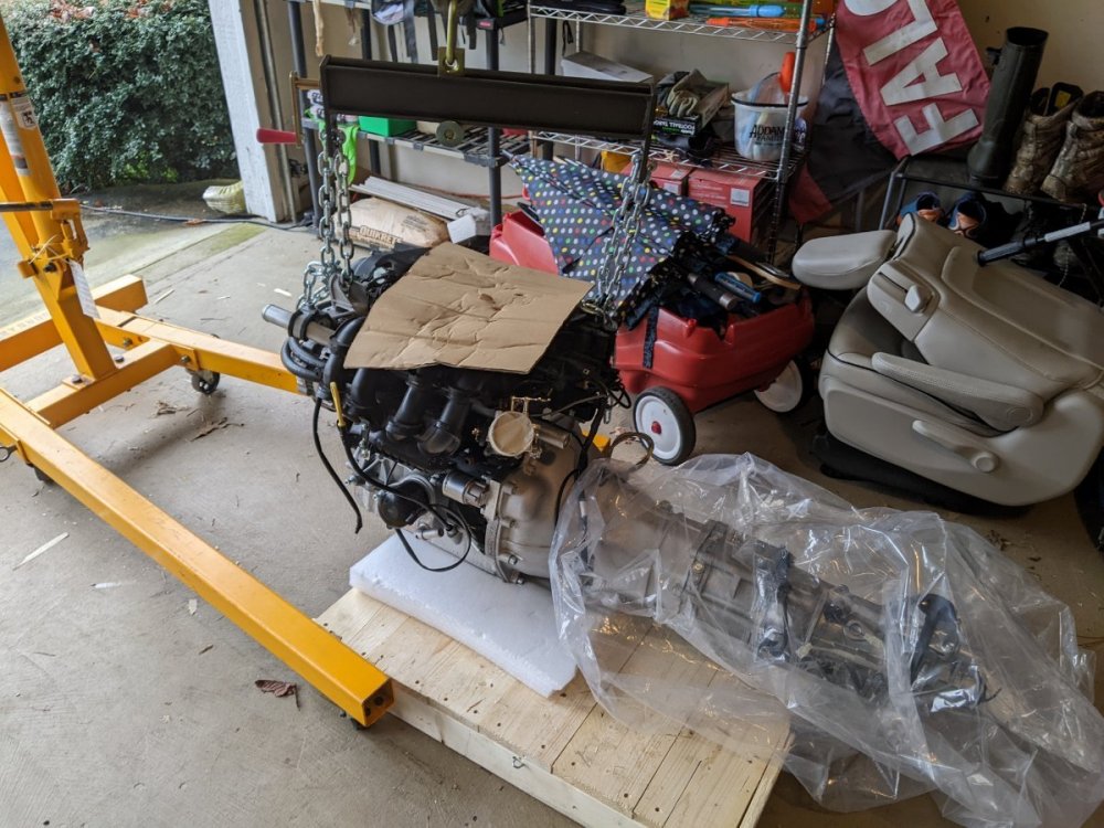 Fifth big build category: bulk of the drivetrain. In retrospect, this part of the build was the most fun and rewarding. In the moment, it seemed like a massive undertaking. My general advice to other newbies: it sounds like a broken record, but visualize and plan what you are going to do and then take your time. It will fit! The biggest issue was removal of the starter motor for the bell housing / transmission mating. There is one bolt that seems impossible to remove. You'll know which one. I finally removed it after buying several socket extensions and taking a LOT of time. Of course, reinstalling the starter motor took about 5 minutes! I sprayed waterproofing in the bottom parts of the interior body and other crevices. I read that these can trap water and cause premature rust. I intend to (essentially) daily drive the car, so I figured this would not hurt. You will see below that I had lots of "help." Really, just one friend to help manhandle the engine/transmission. More specific advice largely echoes the blogs: - buy or rent a load leveler to go along with the engine lift - keep the plastic on the transmission (thin, easy to remove, and protective of transmission tunnel walls) - keep a very steep angle until the transmission is just in the tunnel, then level it out and keep the transmission high - I thankfully did not have any issues with lining up engine mounts or rubbers, but be sure to keep them loose at first to give yourself room to mate them to the engine block - I did not remove anything from the engine block except the tensioner and belt; I did not like the idea of re-installing the starter, alternator, or anything else in the cramped engine bay - take lots of pictures before disassembling anything: it is much easier to reassemble