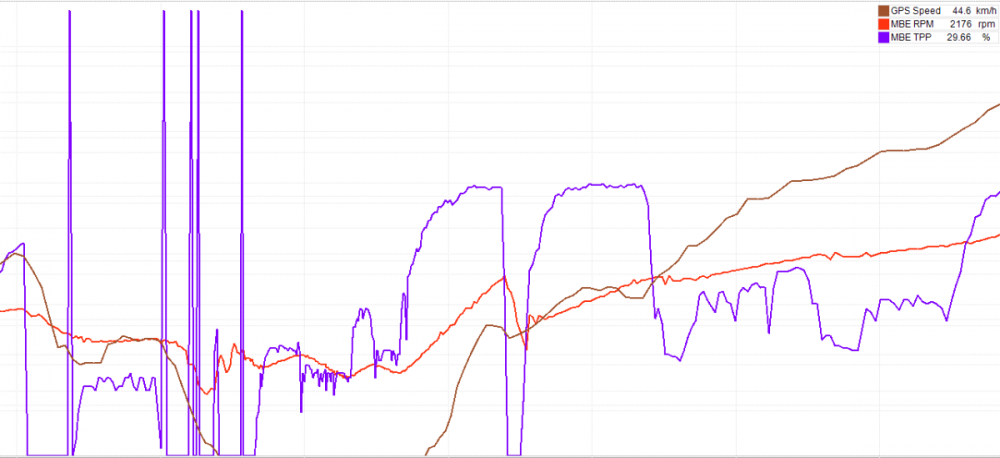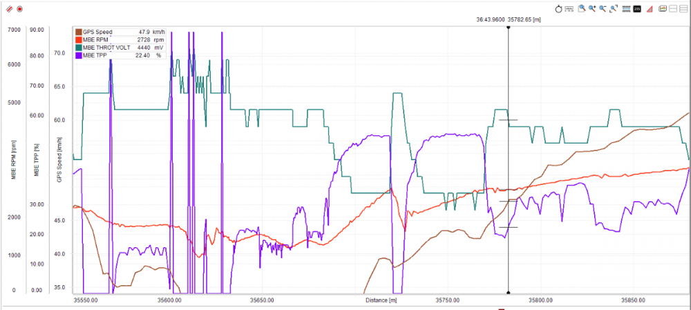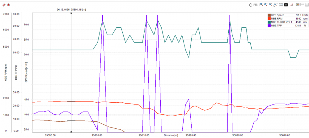 Collected some data logs on a drive this morning. All screenshots are taken at the same zoom level and show Speed, RPM, and TPP only. I believe there is one that shows the TPS performing correctly and two with significant evidence of problems in the TPS. I plan to look for corroded electrical terminals at both ends of the TPS wiring but is this an obvious 'you should replace the TPS'?