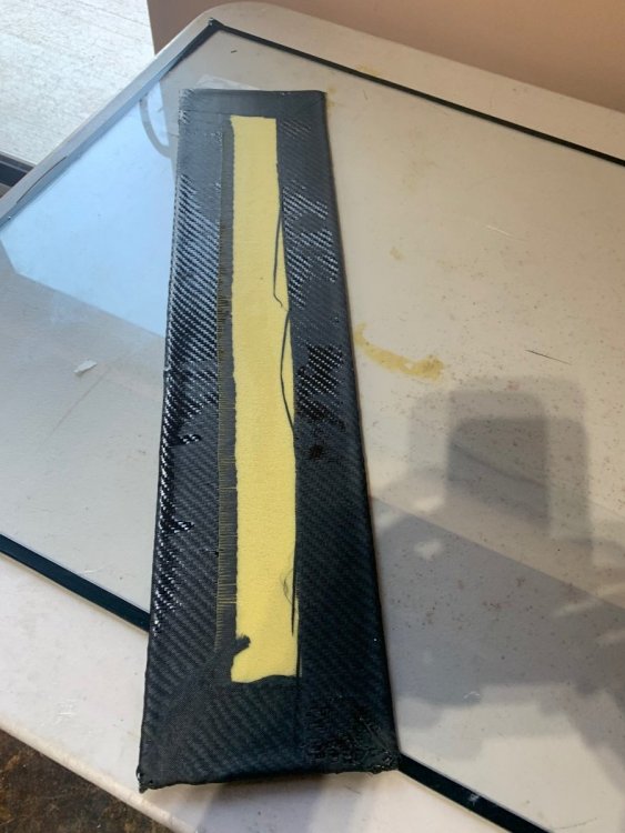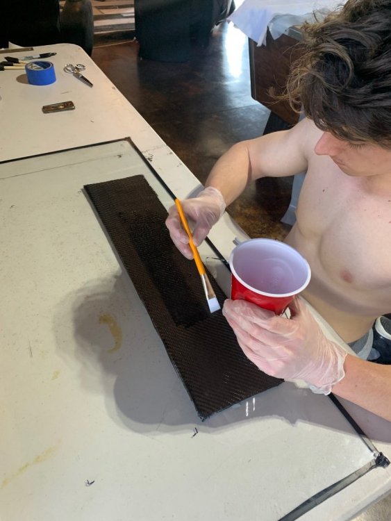 Below are photos of the Parts and steps described above: Applying the Carbon fiber to the Foam Core with adhesive Saturating the Carbon Fiber Finished Parts! They turned out really nice. Very hard, and very light. They also had nice shine to them. Not perfect but not bad for the first couple of pieces considering no sanding or second layers of resin were applied.