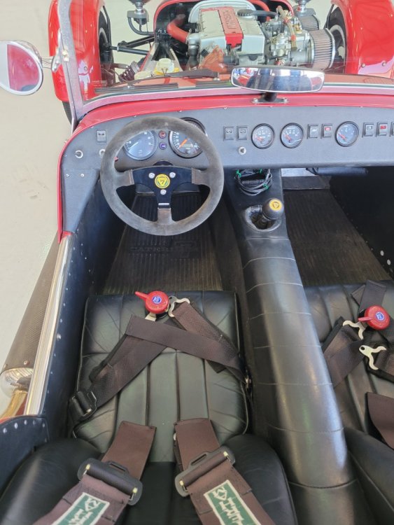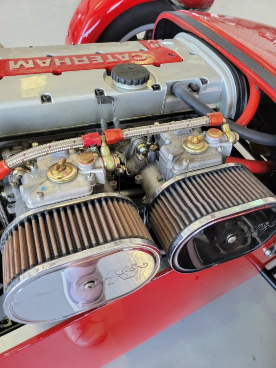 This 1993 Caterham Super Seven HPC is finished in red with a black top cover. It is powered by a 2.0L Vauxhall Red Top inline-four. The engine was tuned by Swindon in the UK and is rated at 218HP. The 45 DCOE Weber carbs were rebuilt by the expert - Pierce Manifolds. Jet kit included.