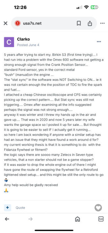 25. Thanks for this, AI at its best…. It’s the first reference I have seen to the shallowness of the trigger wheel that Fidanza attaches to the aluminum flywheel being a possible problem?? I am also back to playing with the air gap by trying to grind down the sensor and also the aluminum “Ford bush”.. crazy part is… the tolerance required by Omex for the air gap is 0.3-0.5 mm. I am trying to work on a plan B… My preference would be NOT to have to drop the engine out (I didn’t put it in so I am a tad intimidated by that) as I understand it EVERYTHING will have to come off that engine again first! Does anyone have a video or reference they can suggest for removing engine from a seven? If I did that then I guess Retroford in the UK for a new bush and lightened steel flywheel? Or open to suggestions? Or a new ecu sourced in North America? any suggestions for that? any other thoughts if you were wearing my shoes? Thankyou to all for your kind responses 🙏