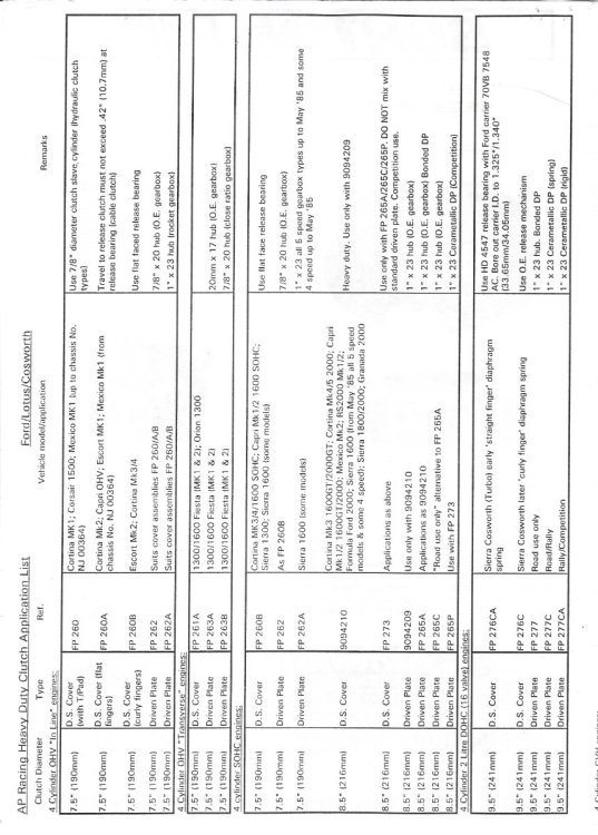 Hi CHristopher. According to author Paul Davies who wrote a book for Cars and Car Conversions titled "Tuning Four Cylinder Fords" (published 1971), quote: 'First all-syncro box was that fitted to the 1200cc Anglia Super and the 1200 Mk 1 Cortina. Apart from the advantage of having a syncro first, this unit should be regarded in the same light as the 105E/109E boxes (my note - no syncro on first on these earlier boxes) having ratios unsuitable for spirited motoring. In this same form this box was also used in the 1500 Cortina, Classic and Corsair models, and - initially - in the GT versions with the addition of a remote change" (remote change part 113E). He also notes: "Ford Performance Centre (as it was then) marketed a special kit which provided uprated 1st, 2nd and 3rd cogs for the 1500 GT casings." These were later incorporated into the 'new' (for 1967) box known 'incorrectly' (Mr. Davies' words) as the 2000E box (actual 2821E). The 2821E was later fitment into some 1969 manufactured Lotus Seven Series 3 models as supplies of the 116E dried up, plus the Seven Series 4 and Elan. The Lotus Cortina Mk 1 received an ultra close ratio box which Mr. Davies noted proved a little unsuitable for everyday use. In the Lotus Seven Owners Manual, Lotus refers to the 116E as an engine and gearbox combination. Christopher, I mentioned to you once before about Burton Performance in the U.K. I realize with the ongoing tariff situation that importing from the U.K. has become overly expensive, but Burton does have good reference material for clutch and gearbox combinations. The 1 inch 23 spline you note was used with the 'Type E' Rocket Box' (single rail operation - as used on the European Ford Taunus and others?). The original equipment gearboxes used the 7/8" x 20 hub according to Burton. I will attach a page from their old print-out regarding AP clutches (these original AP clutches may not be available now, but replacements are), which may help decipher the combinations. If you think it will be useful, a copy of the latest Burton catalogue may be very helpful to you, or just check on-line https://burtonpower.com Only cost for the catalogue will be postage (no tariff charge). It details the full range of gearboxes produced for the U.K. and European markets with all the necessary accessories noted. I have also added a page from the Autopress Ltd Ford Cortina 1967/68 manual where I noted the parts required for my 116E box rebuild as fitted to my 1969 reg. (built in 1968) Series 3. I am guessing that these parts have been unavailable for some time?. Cheers, W.