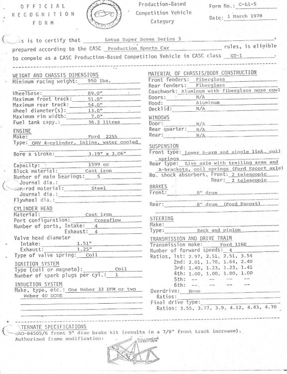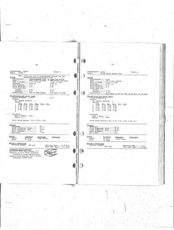 Hi Tim. I found these pages in my notes from when I purchased my car. The second owner had raced the car in Canada. The first 2 pages were from a 'black book' but not sure if it was SCCA or CASC (Canadian Automobile Sports Clubs 1958 - 1988). I have also included a page from the CASC dated 1978, which specifically details the Series 3, however you may note the error of the person/body/organizer who typed in the note that the front brakes specified for the 'Lotus Super Seven Series 3' were '8" drum' with a disc brake conversion as an option.. As front drums had not been used on a Lotus Seven for quite a number of years (and never were used on the Series 3), one can only conclude that they took the info from a very old spec. regarding the Series 1 or early Series 2 cars? Also, not sure if they 'borrowed' the specs from the SCCA? Forum members who race(d) in the older SCCA series may know if the smaller pages are in fact SCCA or possibly CASC specifications? Will. And a P.S. Tim. I hope you won't require a magnifying glass to read the specifications? They are from a very old photocopy from the early 1970s.