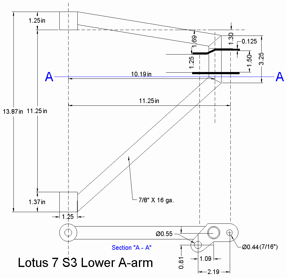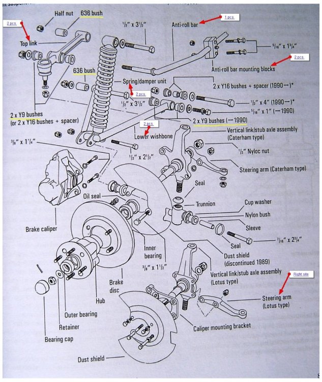 I decided to replace the nylon bushes, dished washers and spacing tubes in the trunnions on my Lotus Seven Series 3 lower front suspension. I had a spare service kit from Rimmer Bros, and followed the diagram included in with the kit. I assembled the unit as shown in the diagram, but it would not fit in between the lugs of my lower 'A' arm/wishbone. The measurement was reading as 1.78 inches total width with the trunnion and assembled kit on my digital caliper. The inside measurement between the outermost lugs on the wishbone should be 1.5 inches according to a diagram kindly posted on the web, and also as per my wishbone (Arch/Caterham manufactured, and fusion welded, not braze welded, as my Lotus originals were. Note: Braze welded suspension components are illegal in my Province in Canada, and possibly others. My Lotus braze welded originals had been 'butchered' by the second owner to attach lugs for towing the car in case of breakdown at the race track). I checked my Standard Triumph Spitfire Mk.1 and Mk.2 parts book, and way back when these were manufactured alongside the Triumph Herald that Lotus used parts from for the front suspension on the Series 2 and 3 (and very early Caterham 7s), the outside cupped spacer/washer was never used. Tony Weale in his book 'Lotus Seven' also shows that the outermost cupped washer was not used. On very early Triumph Herald cars, the cupped washers (inside and outside) were not an included part as shown in a very early Triumph Herald manual that I also have. It would seem that the outer cupped washer was for addition to later Spitfires, Vitesses etc., to perhaps better protect the square section rubber ring placed onto the nylon bush. The Series 4 had 2-part wishbones (on both upper and lower) so fitting the entire kit is not a problem. The only way to fit the 'newest' kit with the 4 cupped washers, the nylon bushes, and the spacing tubes, would be to open up the space between the lugs on your lower wishbone. These are heavy gauge steel, and some bending force would be required. If you do it wrong, the bolt may not fit correctly. It's not very much to open up the gap, but you takes your chance as they say, and it isn't original..... So, if you need to replace the trunnion bushing set-up, just leave off the outer cupped washer, and it should fit nicely. Cheers Will. Lot7Susp.pdf