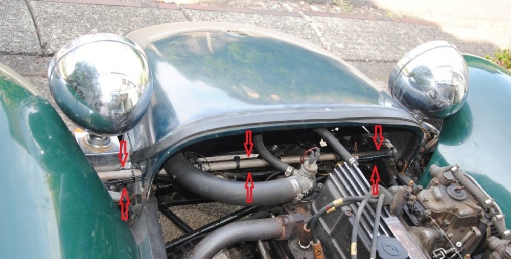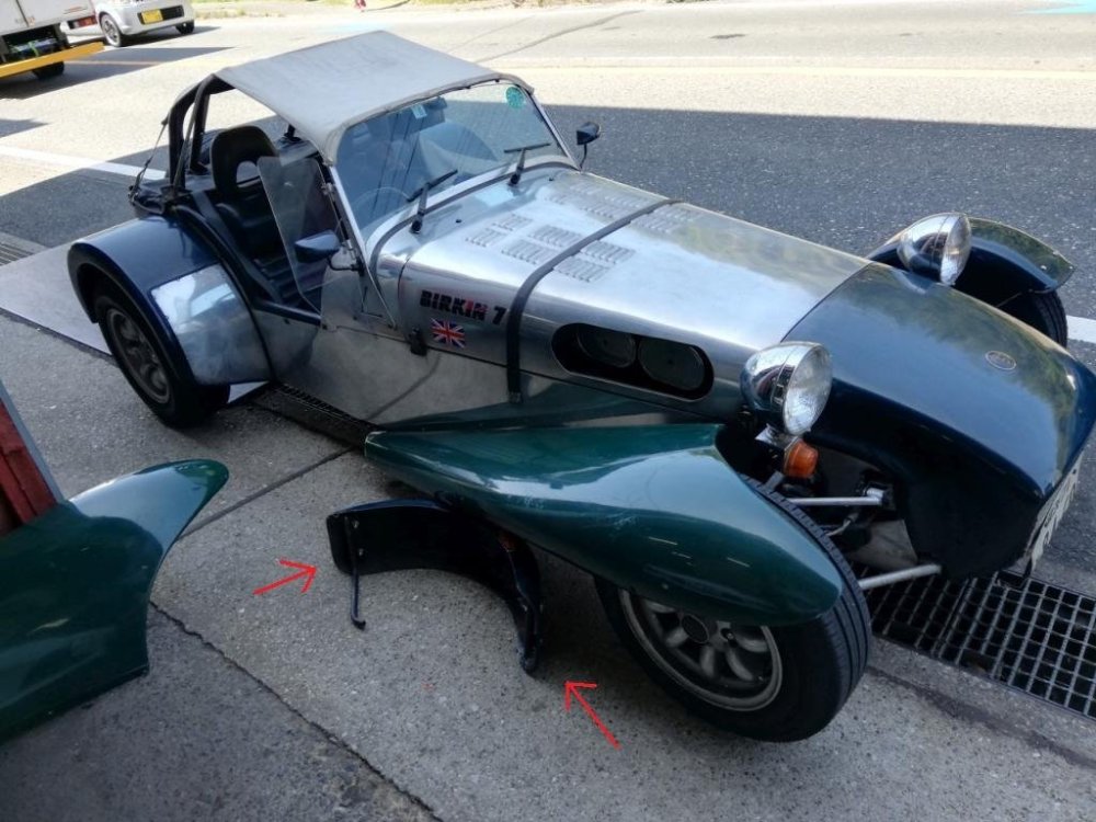 After experiencing fracture of the front fender stay several times after exceeding 130,000 km mileage, which were treated with welding with a central core graft again and again, I make judgements that the welding is no longer the solution, since after the fracture point is treated with welding, the other area is suffering from the mechanical stress and a new rupture happens. My new approach is to replace the cycle fender with the clamshell fender of Caterham. After successfully acquired Caterham's clamshell-type fender on the net auction with reasonable price (circa 50,000 Yen including shipping cost), my Birkin entered the garage of Elite Motors (red arrows indicate the fractured cycle fender in image 104023s) and successfully installed, thanks to Meister Sakamoto (CEO), too), who showed me the installment of front (images 06 and 08) and middle(image 07) stays are MUST.