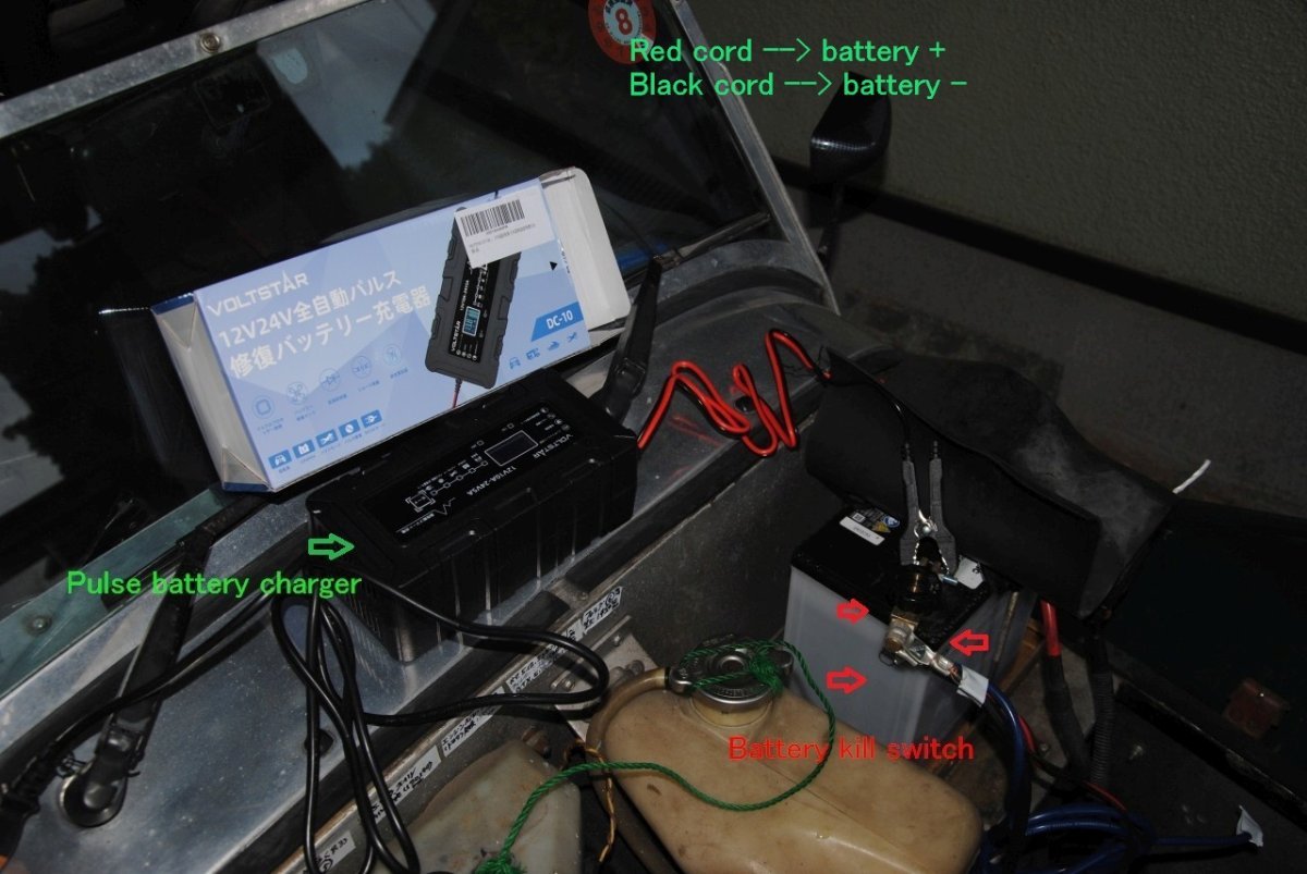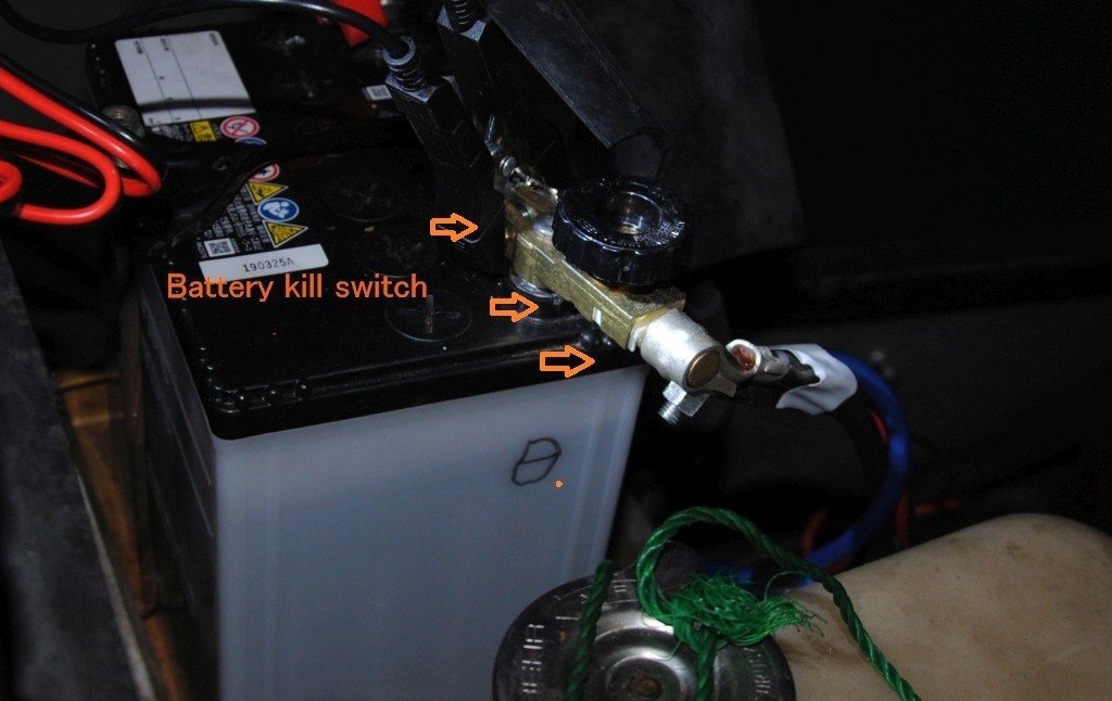 Actually, my Birkin 7 has suffered from drained battery, lately, probably caused by mild current leakage. When I returned from Tokyo home to Hayama retreat after one week, my Birkin's engine did not fire up recently. So I purchased from Amazon, (1) battery kill switch, (2) Jump (kick) starter (USB-charged auxiliary power), (3) fast pulse battery charger. Today on December 14, I return to Hayama and tried these devices. Geez, kick starter works (photo-1). These devices are not so expensive. seemingly very effective for our vintage car. From the first, I install kill switch on the minus (-) terminal. I will cut the circuit when I go home to Tokyo. By turning black circle handle, circuit is turned kill/alive. Very low-cost countermeasure - (Photo-3, 1.jpg). Then I charge the battery with pulse charger connected with home electric current source (Photo-2, 3.jpg). I will continue this for overnight. Actually, after my Birkin reach 140,000 km mileage, several problems are occurring more frequently. Now, 148,000 km, I am making an effort,,,