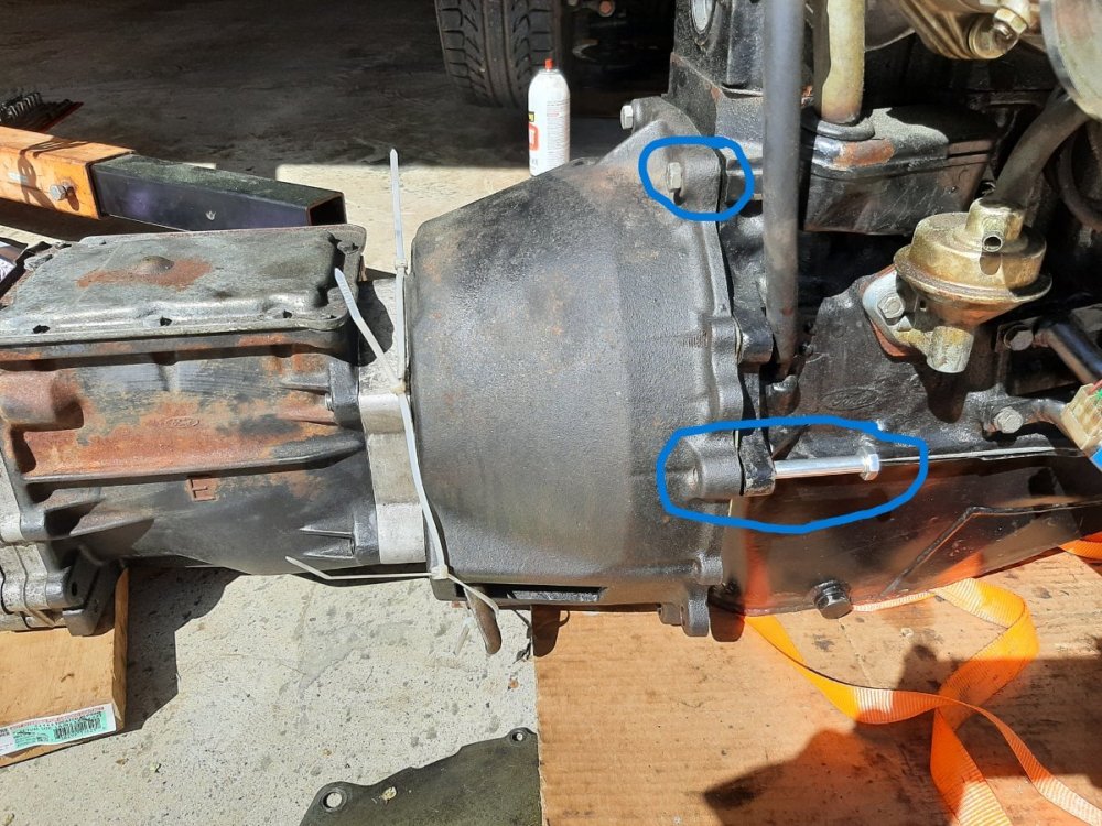 These tips made a huge difference. First I blocked up the engine so the top of the valve cover was horizontal. Then I moved the transmission in close and blocked it up in position. Then I used 4" bolts as shown in the big blue circle to line it up. Picked up the transmission in the middle. Slid right together, no issues. 10 minutes just like its supposed to be. If I had it to do over, I would also use 3/8" threaded rod (or sawed off bolt) in the top holes for extra help. fun fact to know and tell: The bolts which go from the engine side into the bell housing are 10mm x 1.5. The bolts at the top (small blue circle) which go from the bell housing into the engine are 3/8 x16. You can put a 3/8" bolt in a 10mm hole and it will screw in no issues but it will feel a little loose. You will go to Home Depot and come home with a 10mm bolt and it won't fit. If you try to put a 10mm bolt in a 3/8" hole, it won't go. This is not the first time I have made such a mistake and probably won't be the last. Thanks again for the help! -