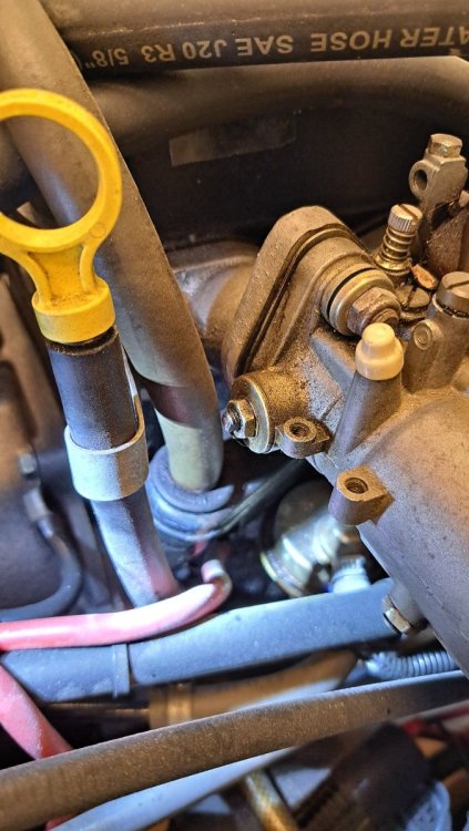 The engine is a 1700 Crossflow. The first image is a catch tank for oil. There is a clear vertical tube to show how much is in the canister. The tube is now full of oil. It was empty for a long time. The other end of the tube connects to a sort of box which connects to the crankcase. You can see the other end of the tube in the second picture going down beside the dipstick. I may have overfilled the crankcase. It loses oil pressure when the dipstick shows half a quart below "H" so I keep it above the max mark on the dipstick. May or not be related, but the oil filler cap on top of the valve cover disappeared. What part do I order to replace it? I'll be away for a few days, looking forward to any info I can get.