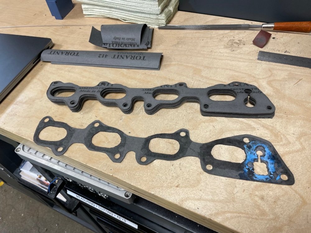 20. I did an interesting trial today - my heads are ported and I need gaskets with bigger openings, so I’ve been making them with a knife. Unfortunately I need to seal a water port with some extra adhesive, so everytime the throttle body comes off, I have to make a new one. Lot’s of work. My record was 3 pcs in one day during the troubleshooting period… Today I tried to cnc cut them, as I’m currently missing access to a laser. Internet claims you can’t machine gaskets directly, as there will be a burr / it will rip. I did a few trials and a 1 mm cutter at 10 krpm worked fine, I just used double sided tape to secure the gasket and had a 0.15 mm air gap for the cutter not to touch the table. There is a burr, but it comes off easily with some sandpaper. Finally some stock: