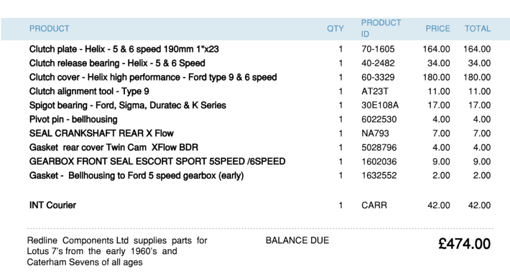 11. If it's of any help, here is a screenshot of the Redline invoice, perhaps the part numbers can be of use (the clutch was Helix): Cheers, -David