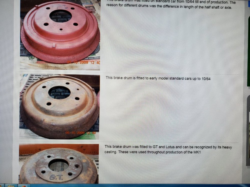 12. All, I purchased a drum from someone who has 14 Cortinas. Per his expertise and, my measurements, and his review of photos, my axle is MKII Cortina GT which had the 9" x 2" drums shown in the photo above. The drum is exactly the same as the barn parts one and fits perfect. Having it resurfaced today, going to fabricated E brake linkage set up, and rear end issue is resolved. Now onto hydraulic clutch leak, and oil pan ground clearance mods... Cheers, V