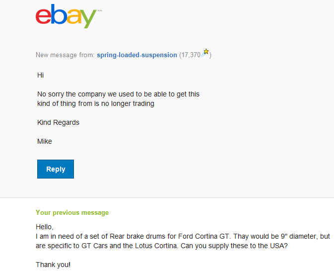 23. MV8, Hope all is good. I got parts for the brake set up off the Capri in your listing. Going w/ 9" brakes from Capri, which is as close as I can get to the Cortina. Although rare, there are a lot more Capri's in the US than Cortinas. The rear was gone from the Mustang II. How did you do that search? The format and locating is very good, I have not been able to find any of those in my google searches? Thanks again. Vin