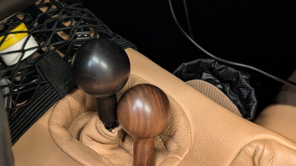 I made a better shift knob. My S3 has little clearance to the dash, I don't care for the metal knob for several reasons. And I like wood. With this I'm able to get exactly the size, shape, position, and material I want. The current prototype is made from $5 ash, 1.0 will be black walnut. The process is a little tedious, but I'll share some details for future reference. Worked with @JohnCh to compare notes. 3D printed a lot of knobs. John noted that a 2mm diameter difference has a meaningful change in "hand feel", and I definitely agree. 45mm feels small, 50mm feels big, my "just right is at 47.5mm (before finishing). Final product is CNC'd in solid wood and hand-finished; details below. I personally like a long "neck" or skirt, and I don't like seams. This is a road car and in Charleston I ride 10 mos / year without gloves. To avoid bulk I dropped the standard brass insert and tapped the wood directly (details below). Ditto, there is no locknut or set screw -- it attaches and stays "clocked" on with friction, but I may use a little RTV to help manage vibration In final installation I'll put a small soft shim under the shift boot, to hold it flush with the lower part of the knob and hide the stick entirely. "final" product, pending my black walnut: Production: acquire or make a slightly oversized block; 2x2x6" ash, for instance. Square one end, this is the bottom surface. carefully drill an 8mm pilot hole to about the appropriate depth up from the bottom, centered and aligned. Tap it to 10 x 1.5 or whatever is appropriate. Drill out the lower part to about 10.5mm (or larger for a different transmission) to accommodate the unthreaded portion of the stick. I was able to run the pilot on my bench with hand tools, there's some room for error. inject liquid CA / superglue to coat the interior threads. Give it a few minutes, swab it out. Drying can be accelerated with water and rubbing alcohol. Do that again for good measure. When it's dry, run the tap again. Make a "sacrificial arbor" with a 10x1.5 bolt by sawing off the head. Screw in the arbor, fix it in the chuck & align to the bottom surface. Machine on that arbor. I ran a pretty gentle process to keep from overstressing the threads, but I think I had a lot of margin for error in here -- there are about 20-30 threads in contact at this point. Finish in place, then remove the sacrificial arbor and remount on the stick. Done! Frustrating limitations: I'd like to have machined the bore & threads, but my setup doesn't have enough Z-range to get a bit 2" deep into a 4" part. I'd like to have a hidden jam nut, but the threaded inserts & nuts are about 15mm across. I could maybe machine slightly smaller nuts and inserts, but that's still eating up about 4-5mm of "budget" in a place I'd like to keep small