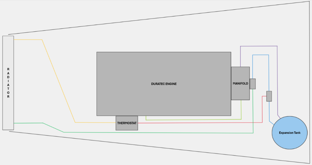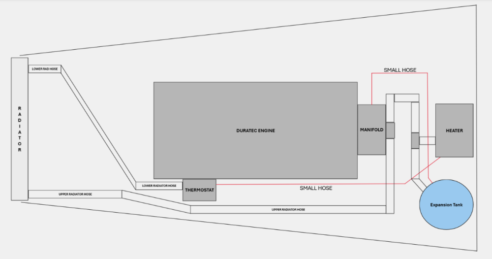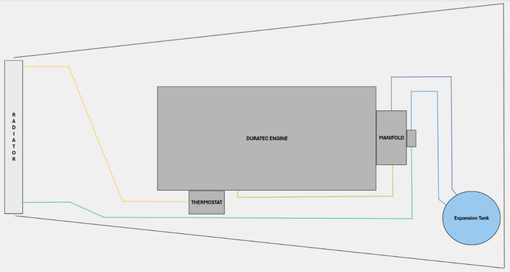That's the thermostat. My system looks fairly similar to the Duratec diagram, but the bypass from the thermostat goes directly to the heater core, and the expansion tank is in a different location.