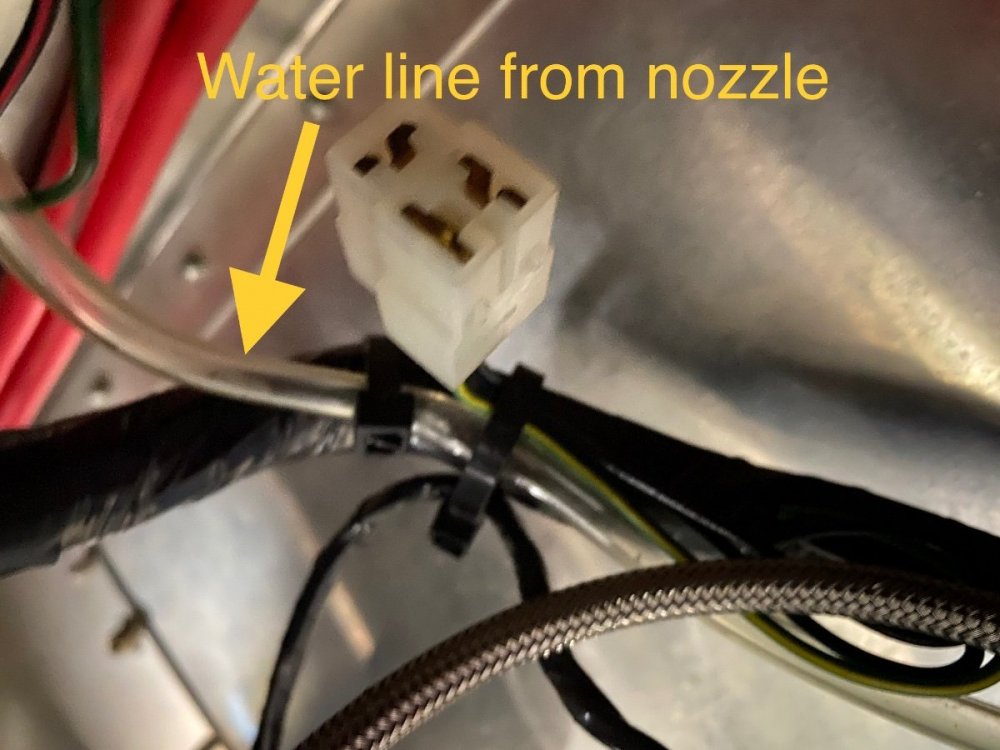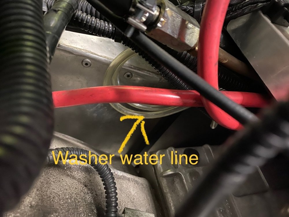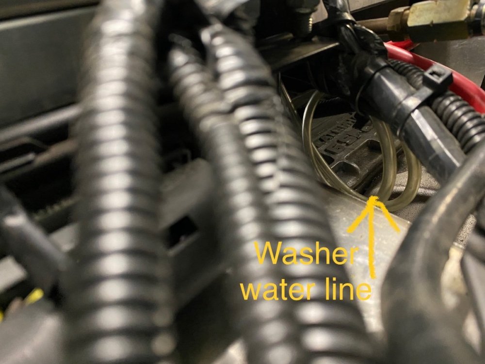 From the washer nozzle I can see that it has the rubber tubing for the water. That tubing goes down from the nozzle and through the firewall with the wiring harness and is coiled up ready to be connected to the washer bottle I have. See pics below.