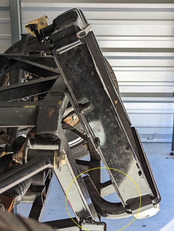 I took some measurements yesterday. I measured in the yellow plane thinking that a slight angle would give the largest height. allowing for some clearance (about 1/2 to 1") on all sides 16" high 20" wide. My plan is to go get some rigid foam board insulation sheathing and cut a 16x20x? block to test fit. After studying the inside shape of the hood, I doubt that knocking off the corners is really going to allow any gains in size. Again hoping test fit of foam board will tell. Looking at fans, there are a lot of 16" ones. I've feelin that radiator needs to be at least 16" tall. Reading about fans, the round fans do not take advantage of the full area of the radiator. I would really like to build sheet metal duct and mount the fan behind the radiator. This may be a real challenge with the tube frame basically in the same space... but I think something like this would work. I also find this radiator interesting in that it is a double pass and inlet and outlet are on the same side. My engine was originally transvers mounted, so both water pump inlet and outlet at back of the block are on the driver's side.