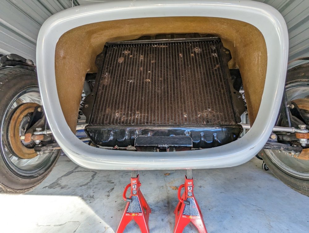 Styrofoam mockup. 16h x 20w x 3thick would not quite fit without chamfering the corners. the top is almost touching, the bottom has at least 1" clearance, sides maybe 1/2". I's going to be very difficult at this size to place the fan behind. I've got it resting on the top cross bar. and out at the bottom. to clearance the lower A-arm bolt. Not really fond of this arrangement. But do like the way this size fills the space. More to come....