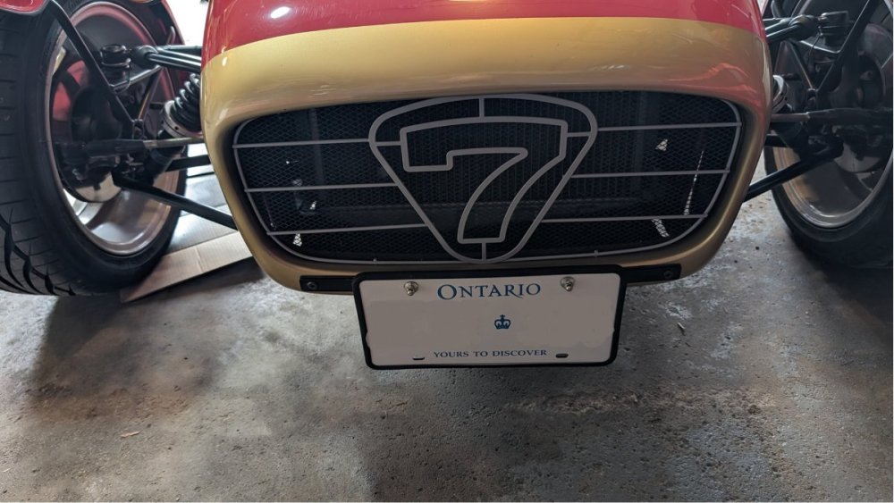 No, the only legal plate is one issued by the province. I know several people have had sticker plates made but if you get the wrong COP or one who has had a bad day it can be worse than getting dinged for no plate. A member of the Lotus Club of Canada had specialty plates that read KEVS 7. However, I do not know if he used the real front plate, a sticker or painted on version as I do not recall seeing the car with those plates. When he sold his seven those plates went on his Europa. (see image) In Ontario, the plate is registered to the owner and do not go with the car. Chalk up one for us doing our part for recycling. I believe this front plate was painted on. Still not legal but probably less likely to cause an officer to turn around and pursue the driver. -