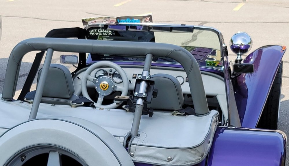 My car came with vintage SPA outside mirrors mounted to the windscreen frames. Also a “Made For 7’s” wide angle that mounts to the top of the windscreen. The “Made For 7’s” is good but not as great as the full size Wink I had in my Europa or my dad had in his Corvair. The problem with it is that I have a very narrow view between the top of the spare and the roll bar that only shows cars close to me. The SPA’s use two screw fasteners to mount to the frame. The dang things will not stay put! I’ve tried everything except drilling and tapping for a little set screw. I have even replaced one with a brand new unit that does the exact same thing. No matter how careful we are getting into and out of the car at some point we'll hit one with the door and it is all downhill from there. Plus at shows people are constantly hitting them when looking at the car. Worst case and it’s happened many times in the first year, is someone who knows they hit the mirror and quickly grabs it and tries to put it back in position which always make it worse. I’ve been looking for motorcycle mirrors that I can use that would put a larger mirror further away from the body. So far no luck. All modern bikes are metric and Harley don’t make anything with a small enough mounting fastener to use the existing holes. I DO NOT want to have to drill more holes. Getting the nuts on the SPA mounts is hard enough.