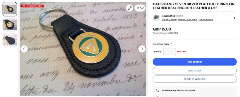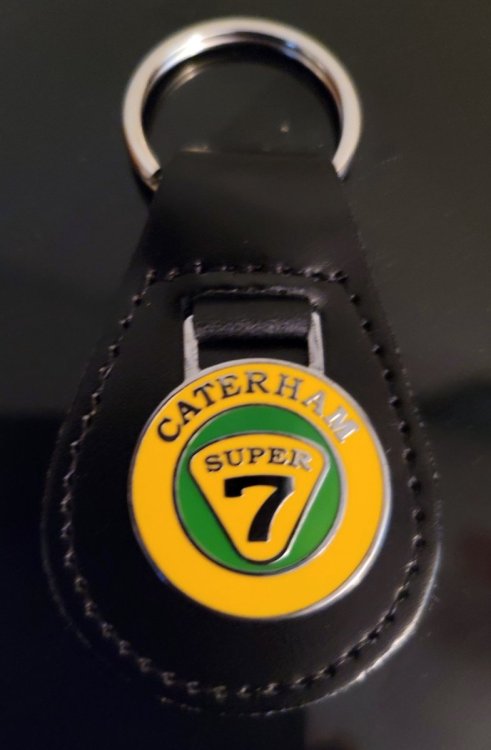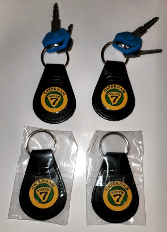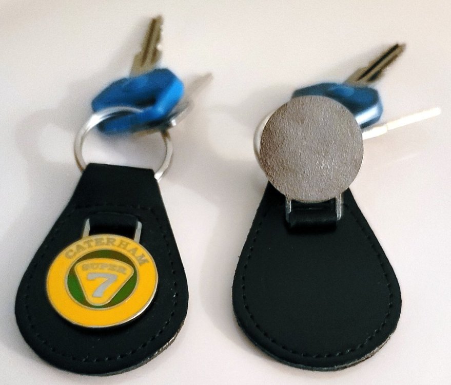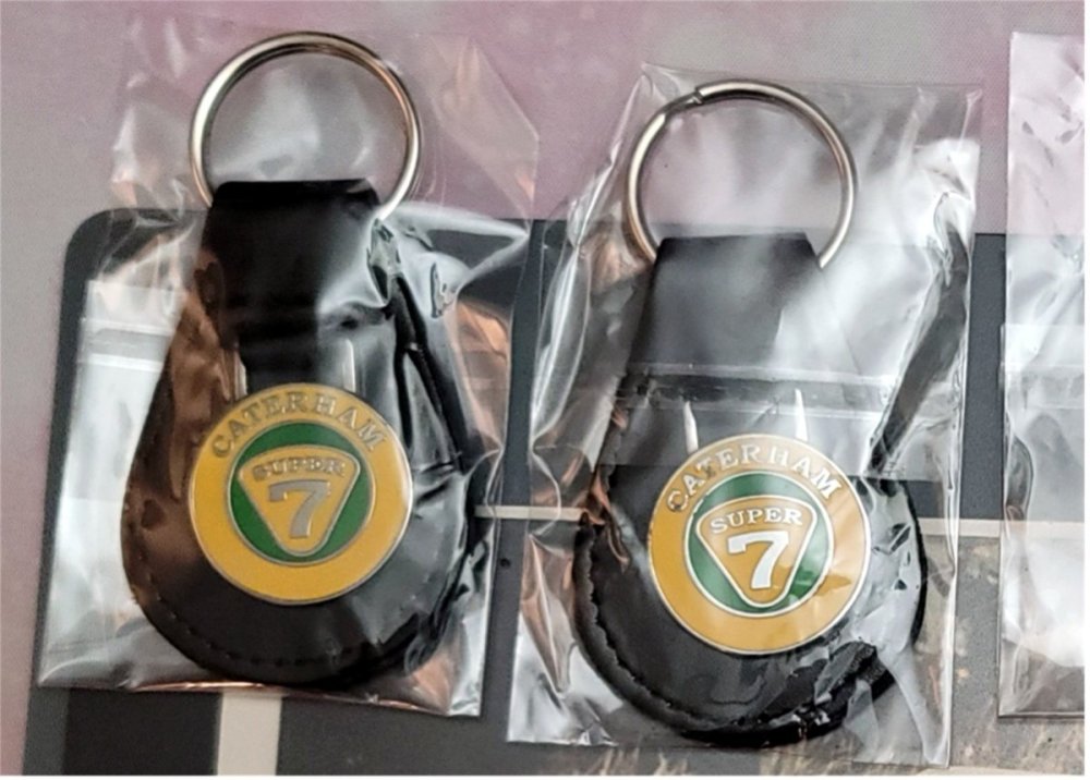 So, I bit the bullet and I ordered key rings off of eBay UK. The one I wanted was GPB15.00 but there was only one left. (see image) I quickly found another that looked smaller and the leather looked more like vinyl in the photo. Funny, the photos had the same background image. I think it was only GBP 5.99 so I ordered one of those as well. I now had two slightly different Caterham 7 key rings on order. Over the following weeks I received two identical messages from the same person saying that they’d been away and would get right on my order. Almost two weeks passed before the first package arrived. Based on the photo it was the “last One”. It looked close to the photo in the ad. The difference being the chrome is raised above the colours and I thought it would be all smooth like the nose badge. A couple of days later I had a notice from eBay UK to rate my experience. The odd thing was it was for the other key ring order. So I waited to reply. Over a week goes by and I finally received the second package. To my great surprise not only are there three key rings but they are exactly the same as the first one. Again eBay UK asked for my feedback so I wrote my little story. I explained my bewilderment at ordering the last one of one type and another one that looked different from another ad. Then, getting the exact same message from the same person that they were late in getting my order out. Now these Feed Back forms are to two different people but it seems that the items are all coming from the same shop. I got a reply from some guy that he’d look into it but didn’t understand how I ended up with three key rings. I wrote him back that I actually received four and not to send anymore. So I have two to use and two set aside. Well, you just never know when you might need a Caterham Key Fob, eh!