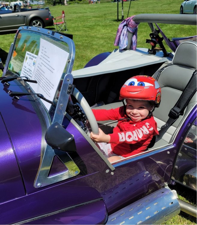 If it’s a daylong event I’ll pull it off for about an hour midmorning and again about hour midafternoon. Car looks much better with it on to the general public. The gear heads want to see the power plant so on occasion it will come off to expose the hamster wheel. If it’s a judged event I follow the rules. Usually that means leaving it on until asked to remove it. If it’s for a short time the wife holds it. For longer periods I lean it up against the spare tyre then place a folding chair behind it. (see image Bonnet Off) As other’s have said, let the little ones have fun and feel they are part taking in the show. (see image Next Gen Driver) As to Timothy Keith-Lucas’ comment re: “…campaign to get all entered cars to have explanatory plaques.” You’ll notice in my show photos there is a plastic covered sign under the wiper blade which does just what Timothy is promoting. Furthermore, you’ll see in some images the purple binder that is always with the car and on display. I’ve mentioned it other threads. It has copies of all the documents and even colour pages from the article that the UK Caterham and Lotus 7 club published in the May 2024 issue of Lowflying called “A Glass and a Half. As a side note, I grew up with antique and classic cars. No matter how rough it looked, you never went near a car afraid a button or zipper might scratch. Most of the cars had signs like “I’ve been tubbed, scrubbed and rubbed so please don’t touch me.” Or, “Do not lean on this car unless you are completely Nude!” My father on the other hand was more than happy to let anyone and everyone sit not just in the car but climb up into the rumble seat of his 1934 LaSalle. Also, the wife has been known to dress up the car, (and ourselves) to celebrate special events like our 50th wedding anniversary.
