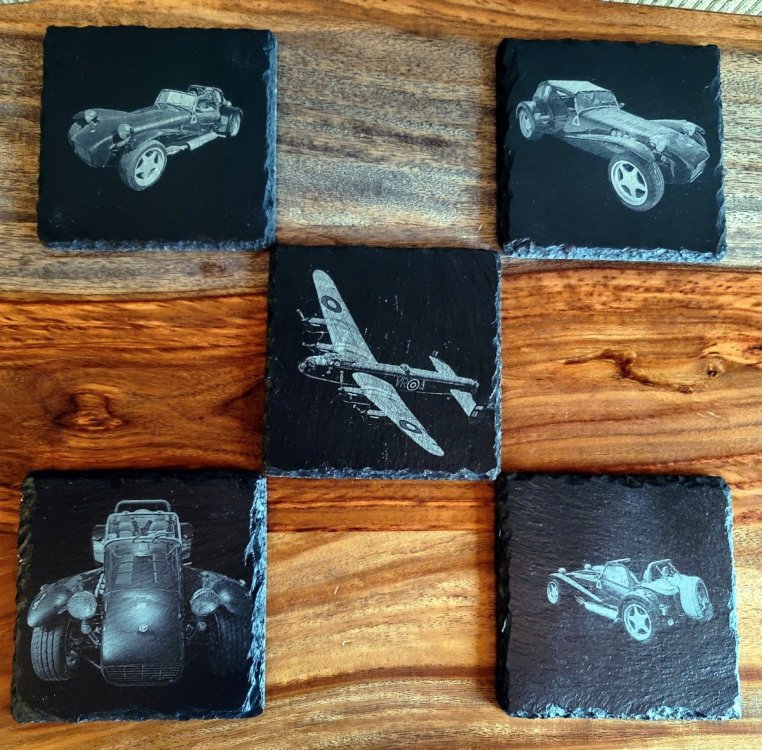 When it comes to Caterham items I have some old and some new. The few books I have are decades old first editions packed away somewhere. Same goes for all my sales literature and most of my Caterham die cast models. (I’ll have to hunt them out just to remember what I have.) I’m sure I’ve mentioned my vintage 1993ish Green with Yellow jacket that my wife gave me for Christmas over 30 years ago. I can be seen wearing it in several of the previously posted photos. I’ve included a couple more to jog your memories. I recently purchased a gently used Black Caterham jacket off of eBay. Both jackets are surprisingly warm. The wife surprised me with a custom order set of laser etched slate coasters for Christmas this year. She supplied the photos taken at different events over the summer. She also told me the chap who made these is local and to her knowledge only does round or square coasters. I’ll have to look into what else he might be able to do.